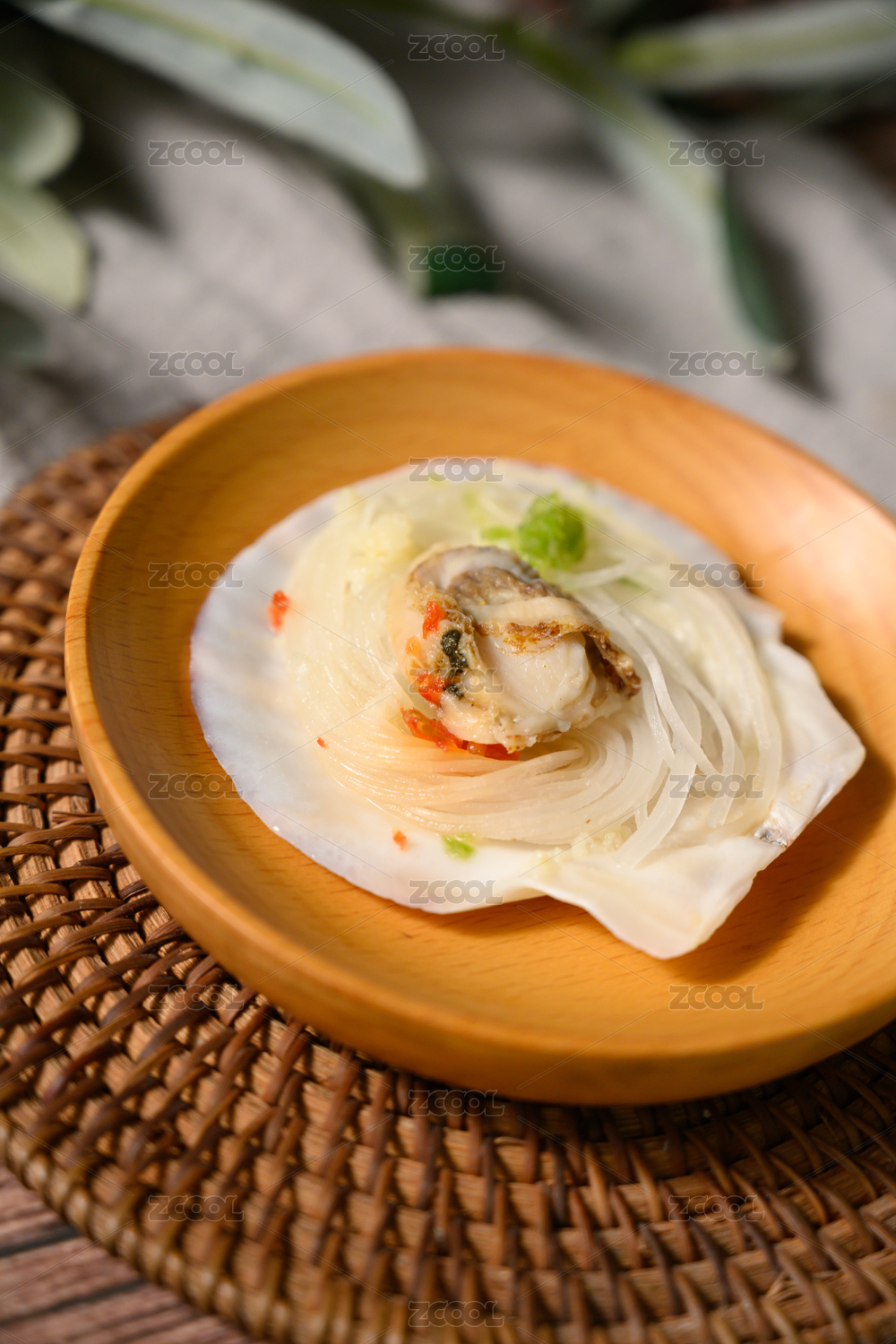 桌面上的盘子里的美味可口的粉丝蒸扇贝