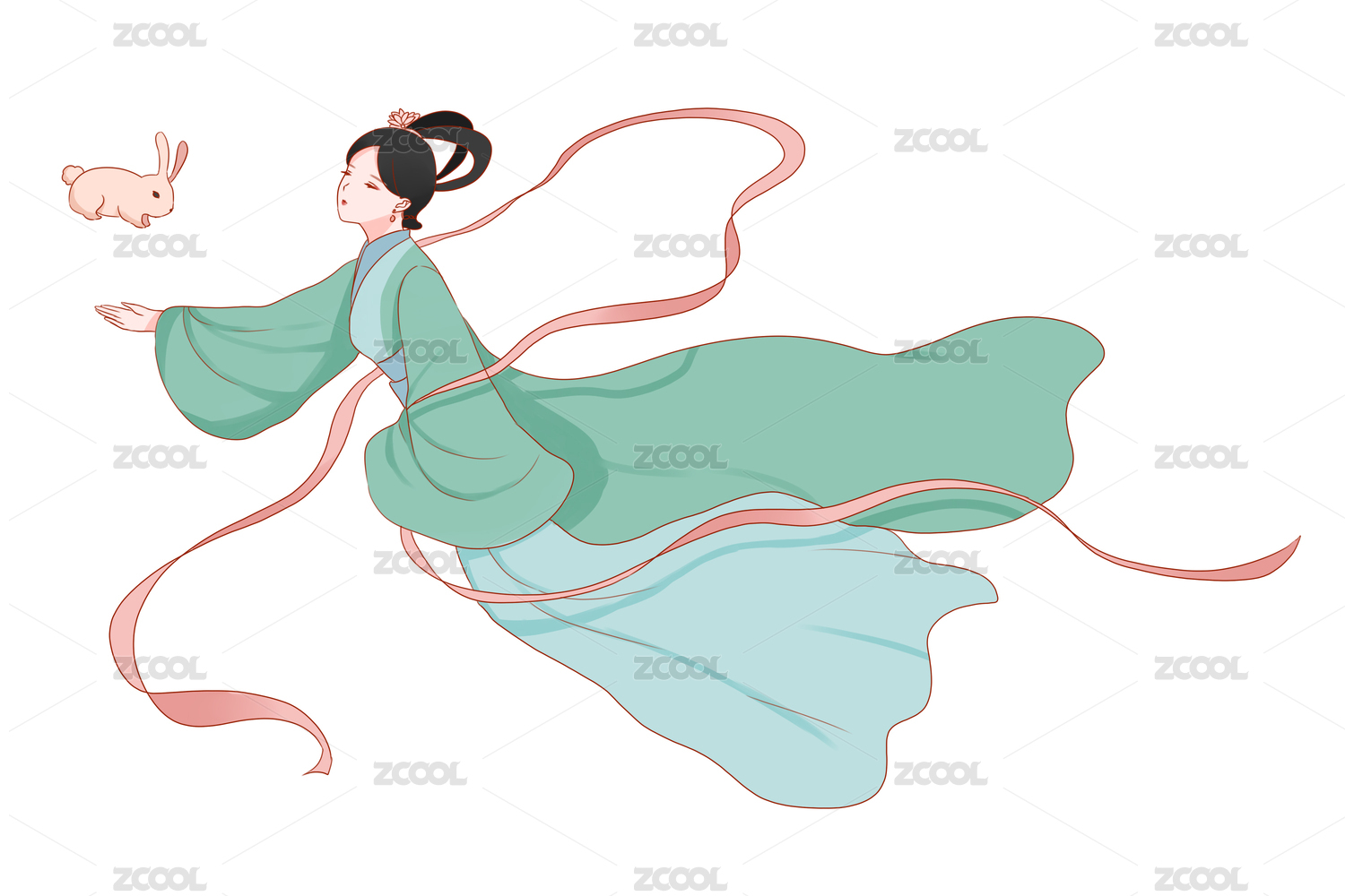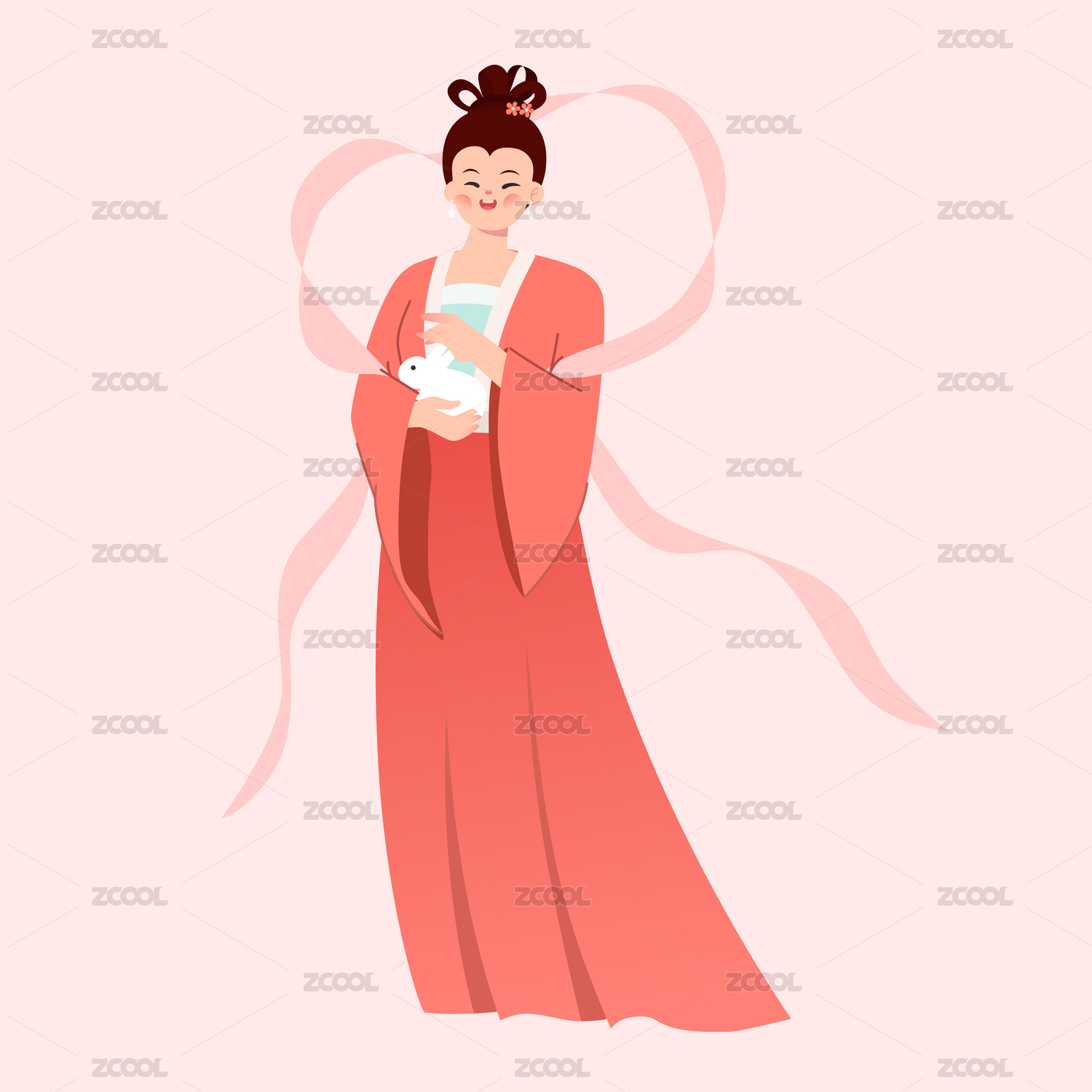 中秋节嫦娥抱着玉兔飞天矢量元素插画