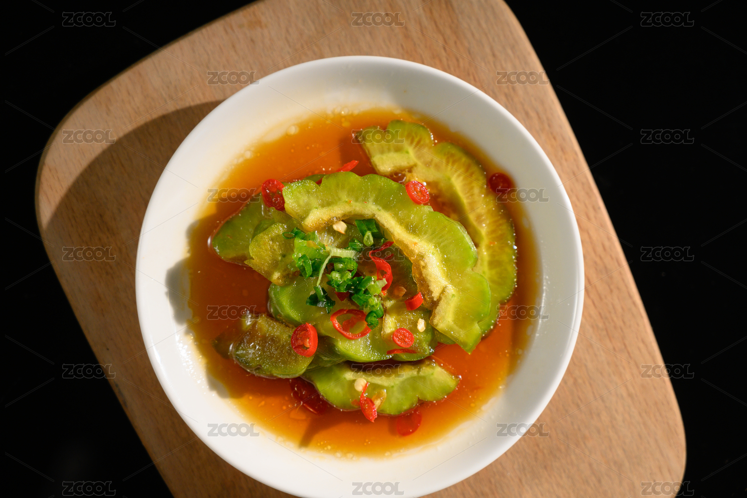 桌面上的盘子里的美味可口的凉拌苦瓜