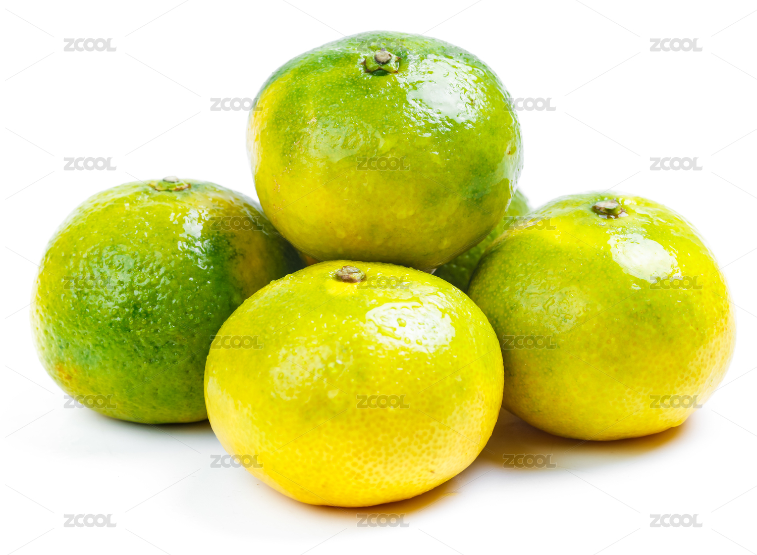 白底上放着一个黄皮清香蜜桔和一个青皮蜜橘