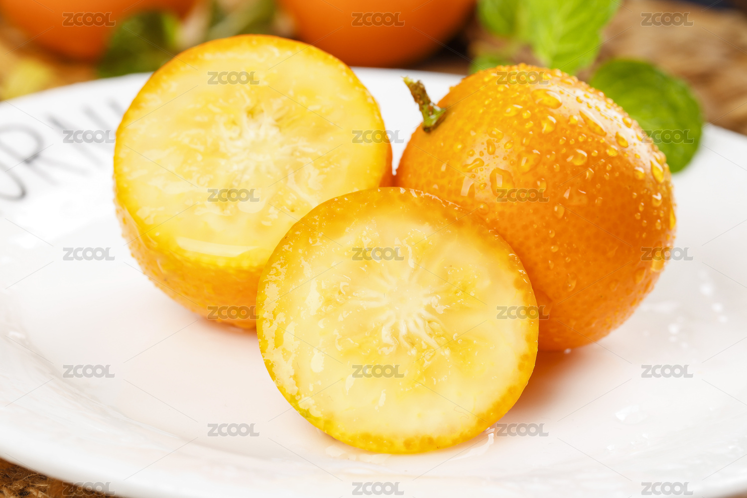 白底上放着一盘小金桔和切面的金橘