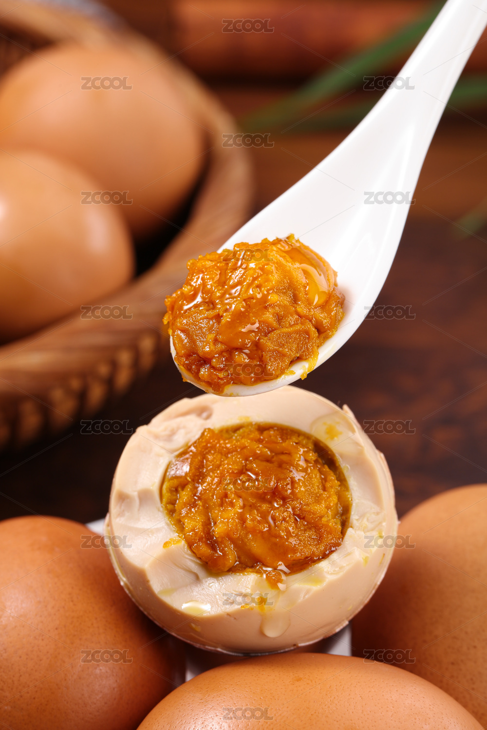 木纹背景上剥开的咸鸭蛋