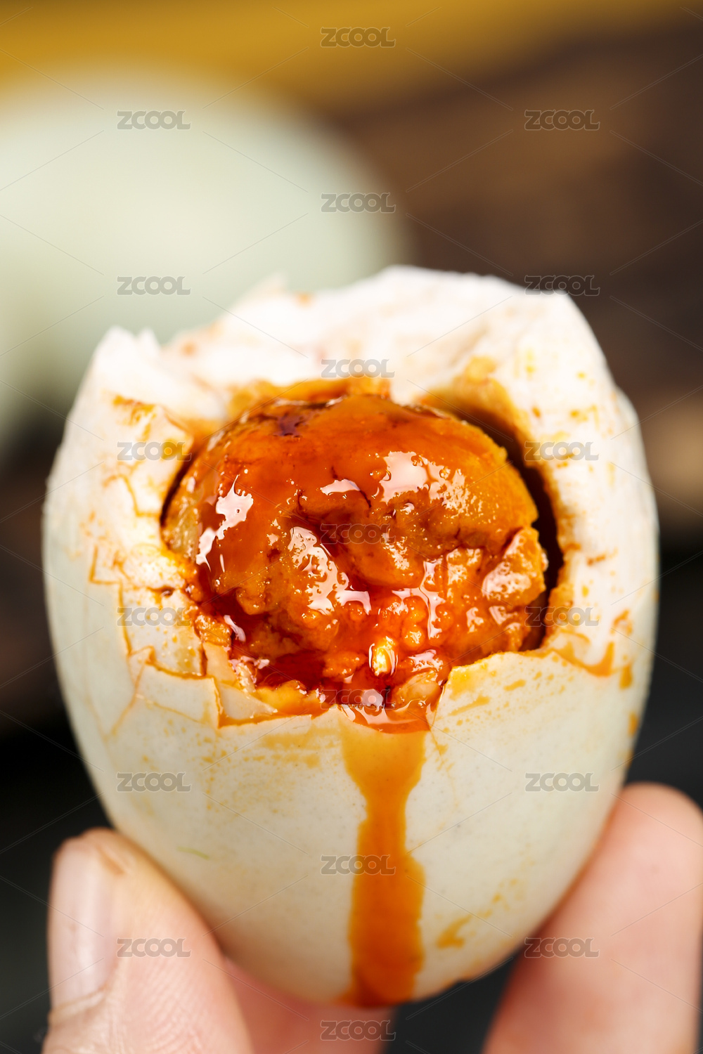 手上拿着一个完整的咸鸭蛋和一个磕开咸鸭蛋