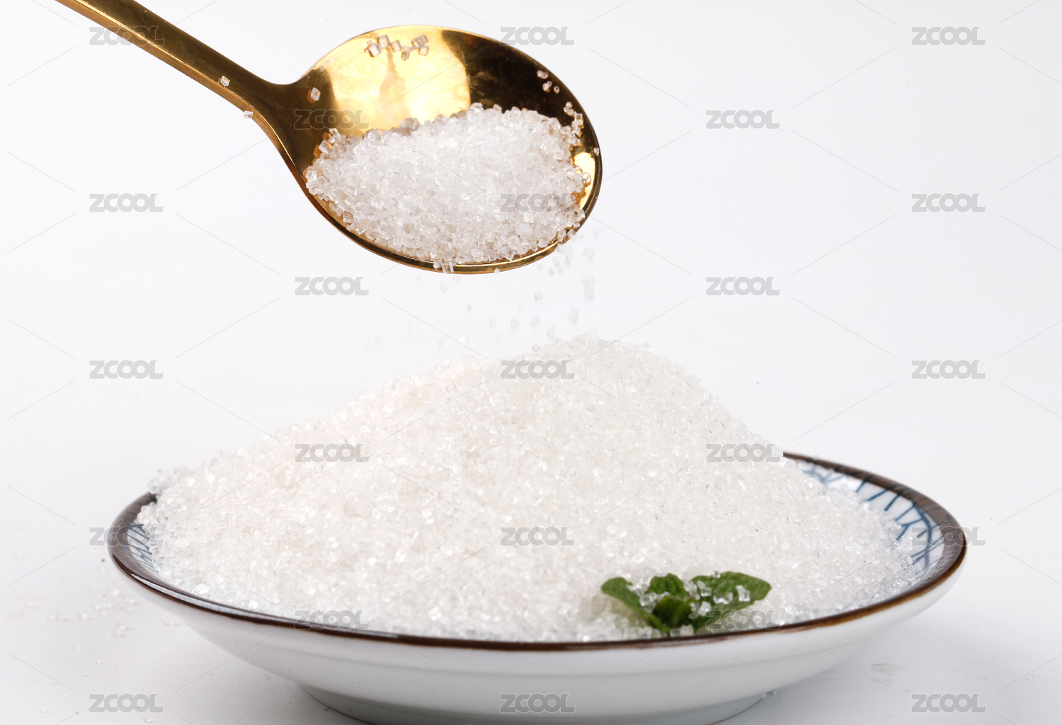 白底上放着一盘云南白砂糖和勺子上挖着白糖