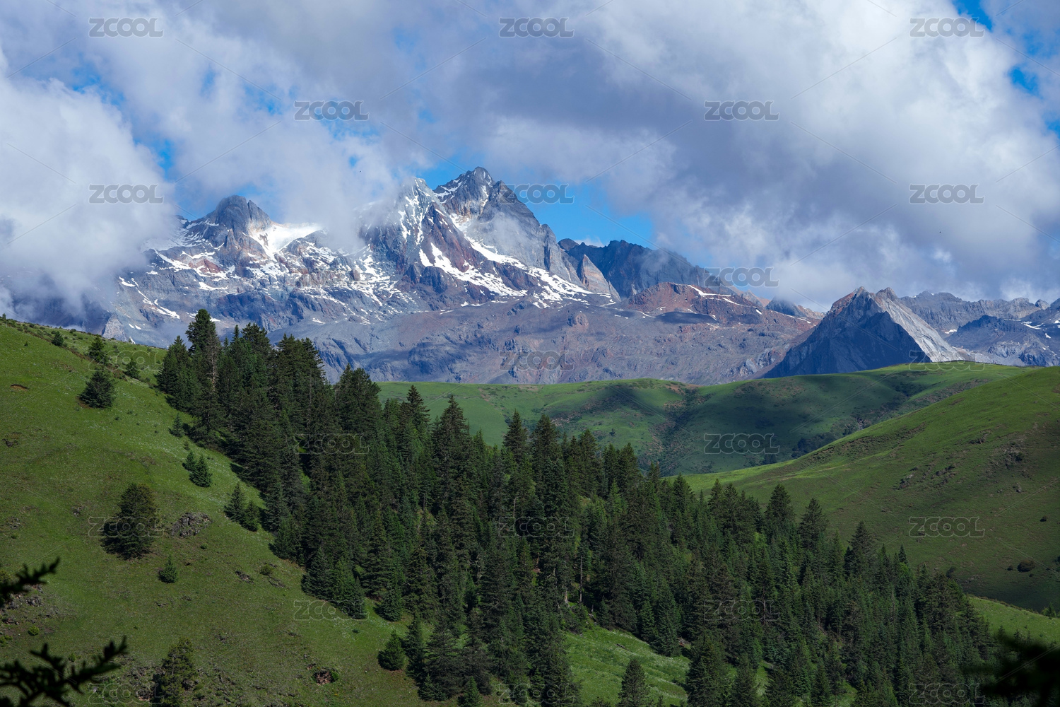 四川格聂雪山下的翠绿山坡