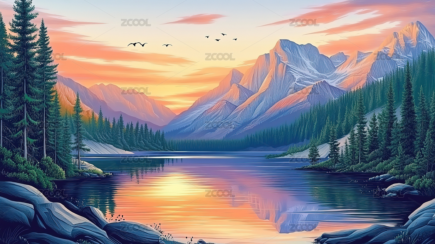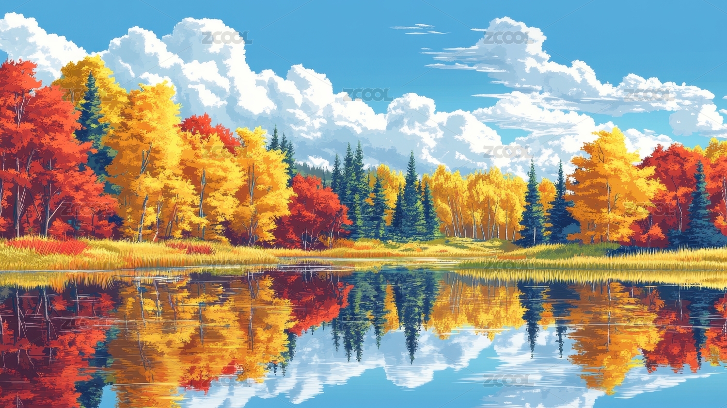 像素风,太阳,插画,风景,海边,暖色,抽象,壁纸,绿植,树林