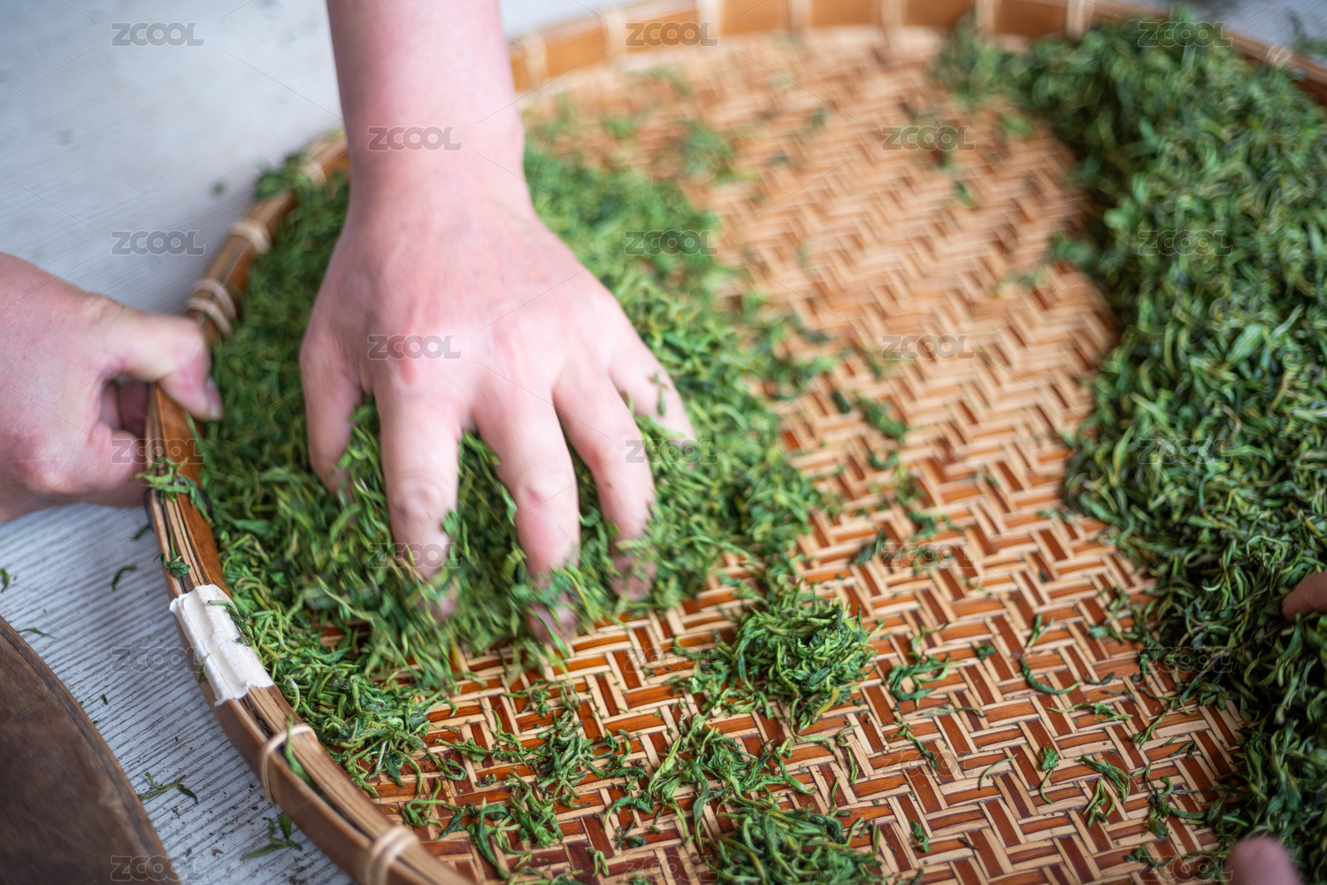 一筐采在竹篮中的龙井茶鲜叶静物照
