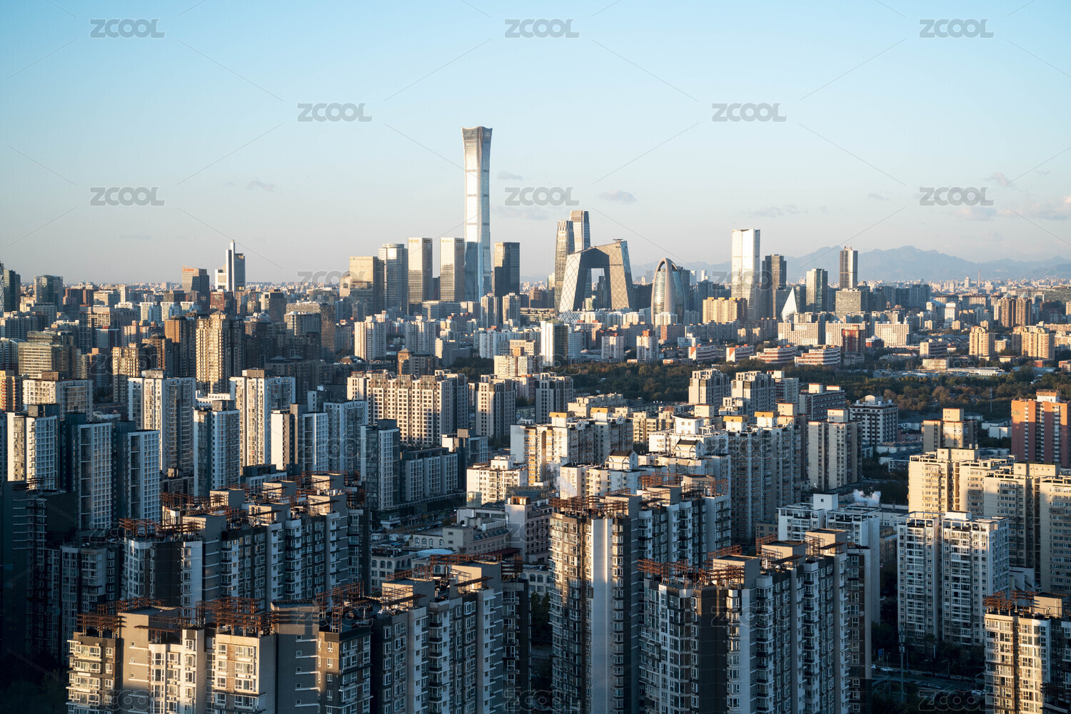 晴朗的傍晚鸟瞰北京城市天际线