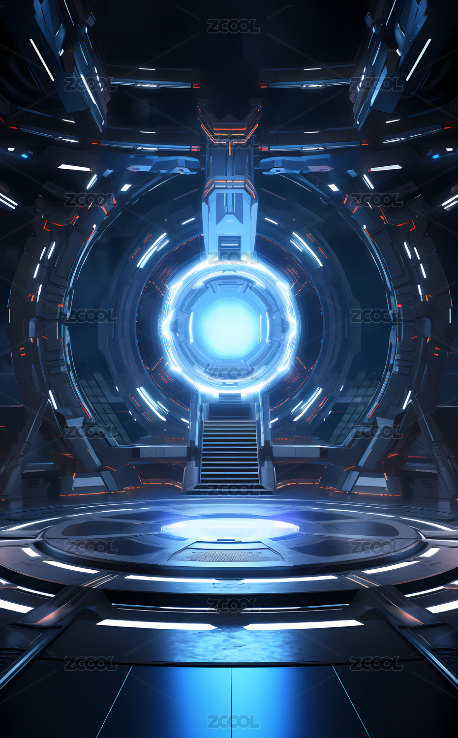 未来感,展台,LED灯光,蓝色主题,圆形平台,精致场景,对称构图,科幻风格,未来元素,场景