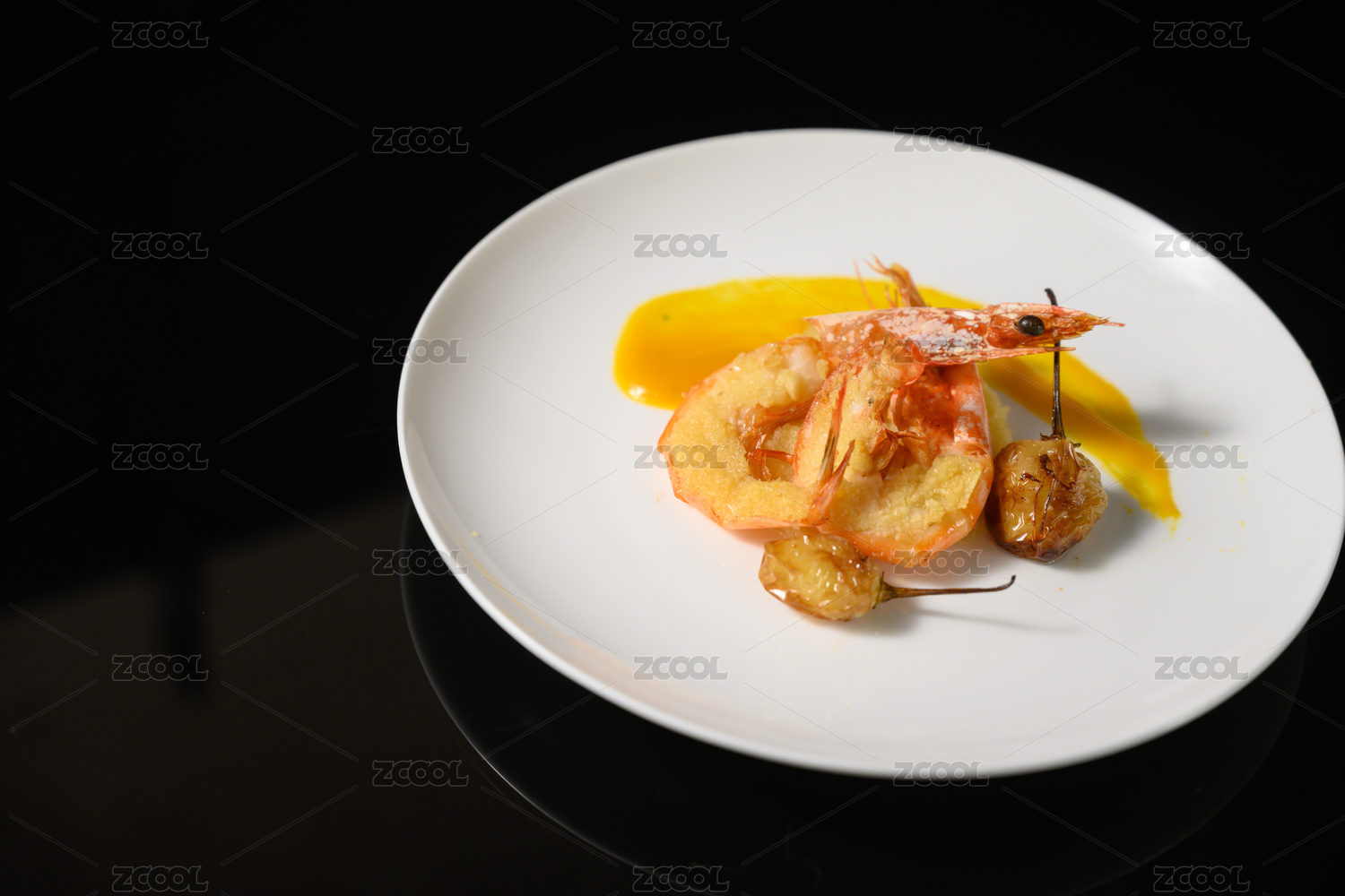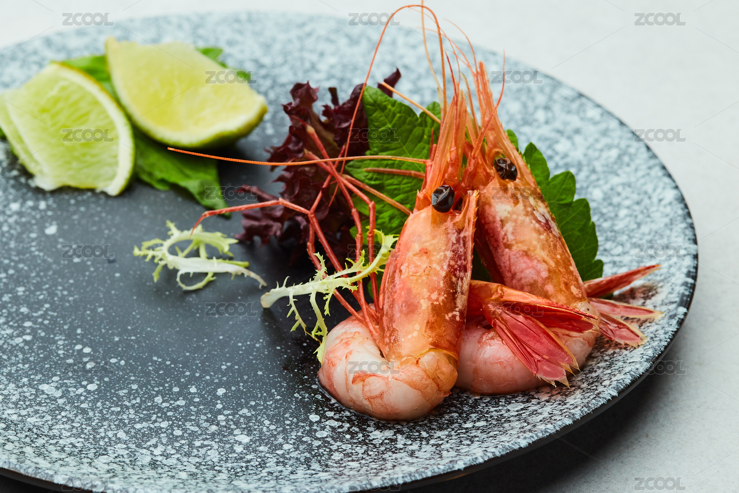 桌面上的盘子里的美味可口的蒜蓉烤大虾