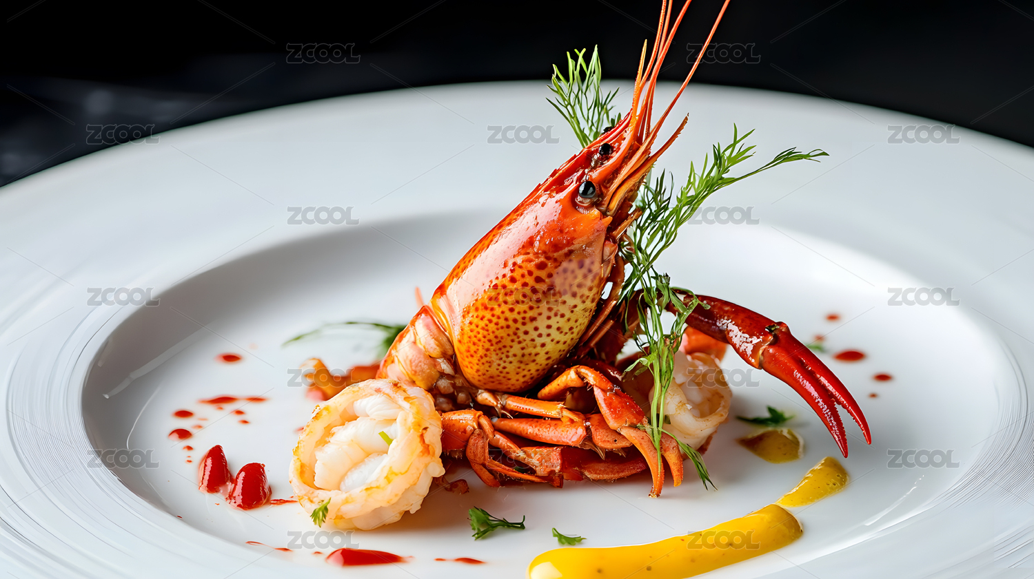 白色盘子上整只劈开波士顿龙虾配罗勒小番茄