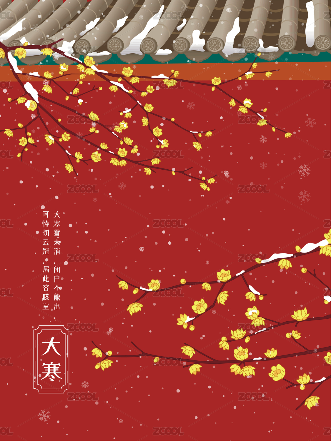 冬季大寒腊梅花盛开红色宫墙背景插画海报