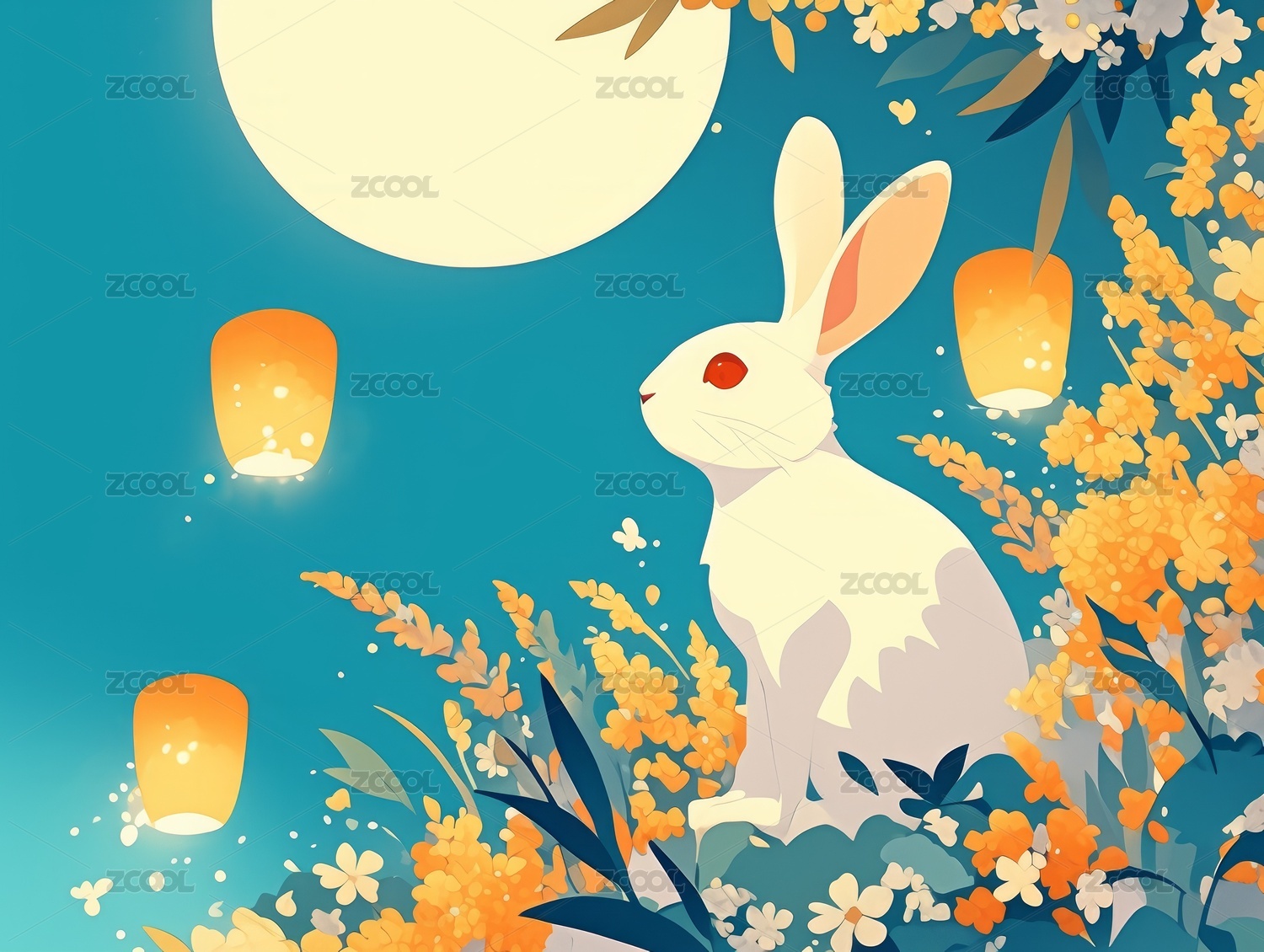 兔子玉兔灯笼月亮桂花可爱扁平插画