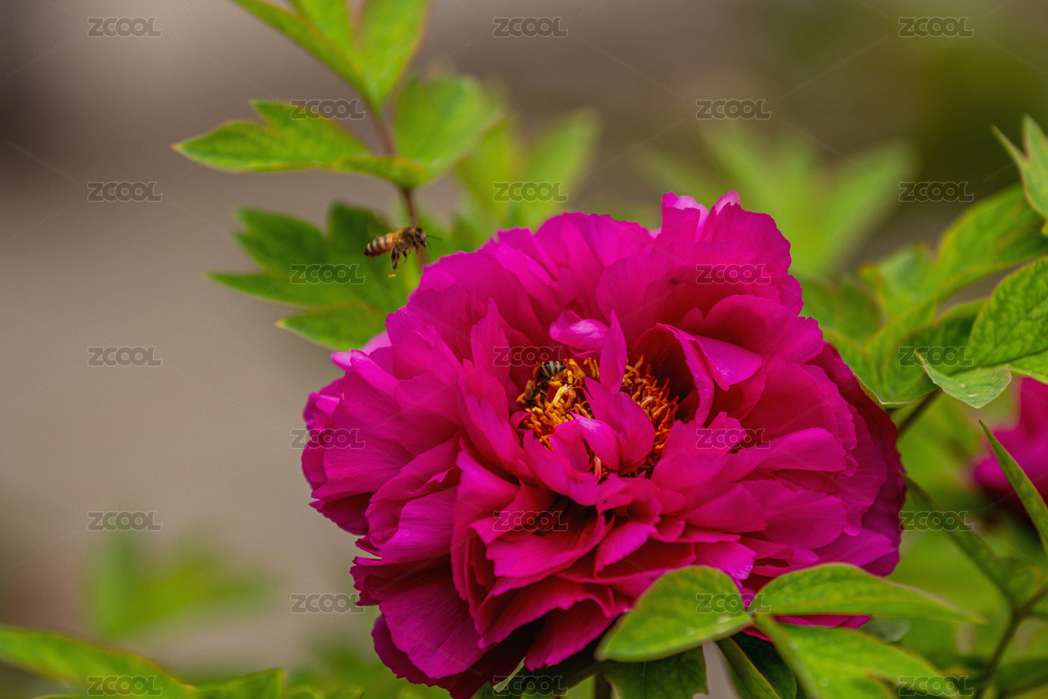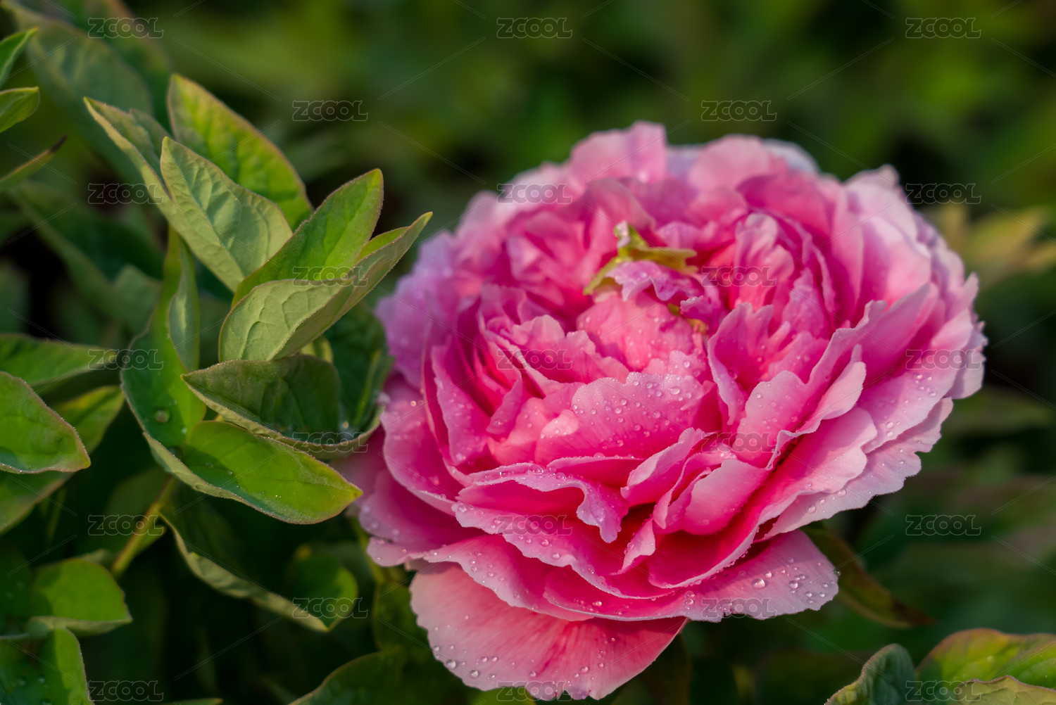春天早晨阳光下盛开国色天香牡丹花篱笆