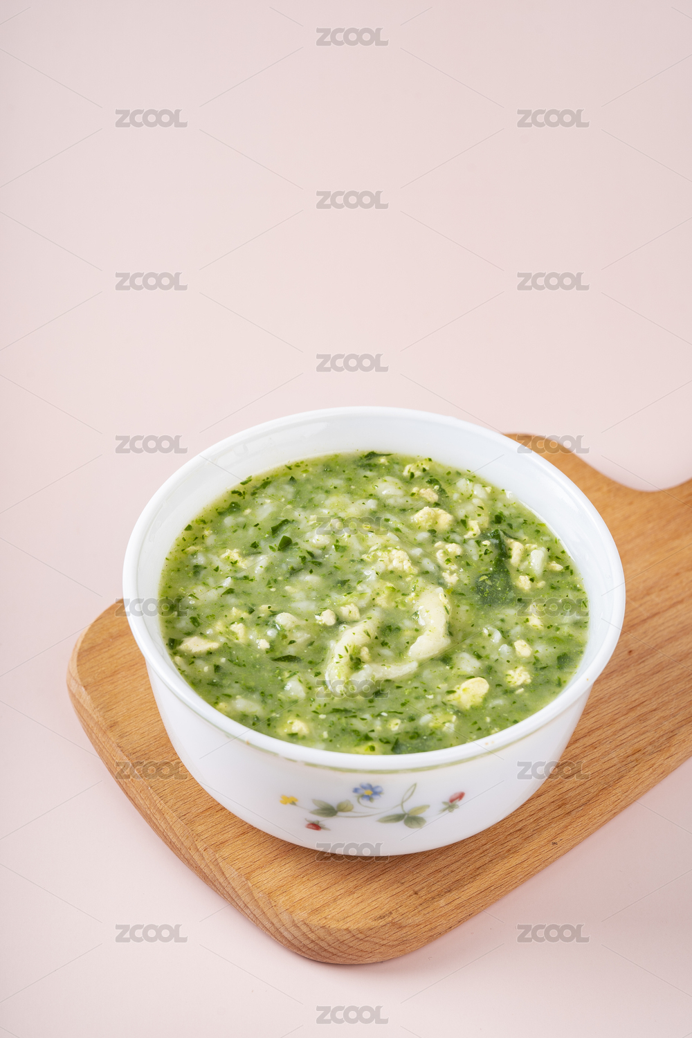 桌面上的青色陶瓷碗里美味的鸡蛋粥