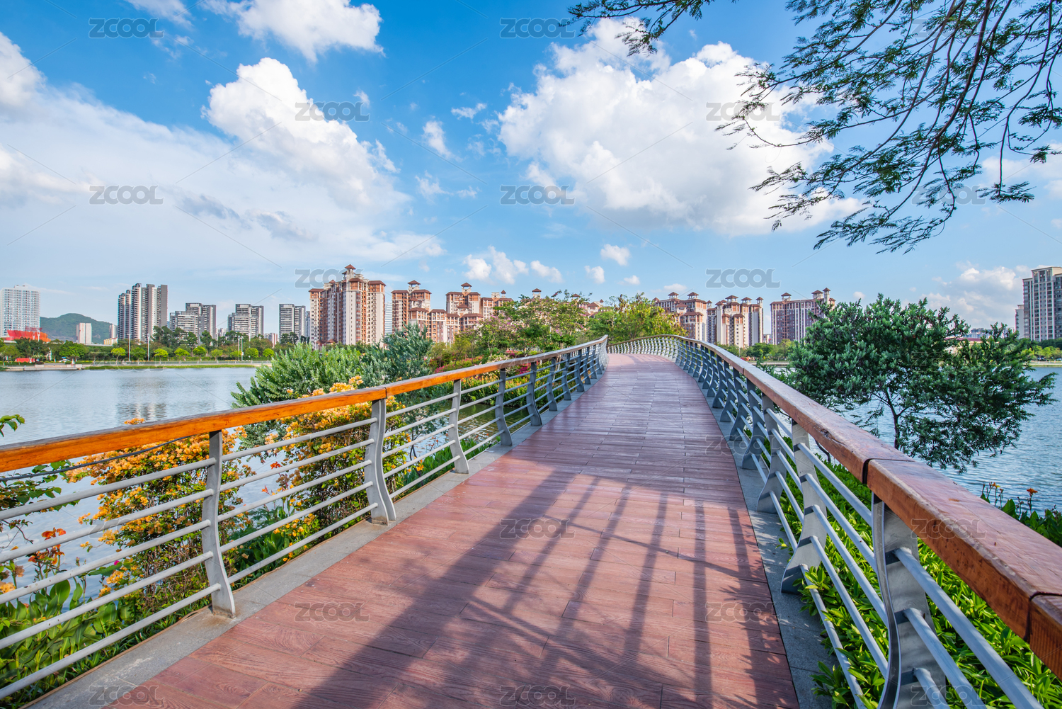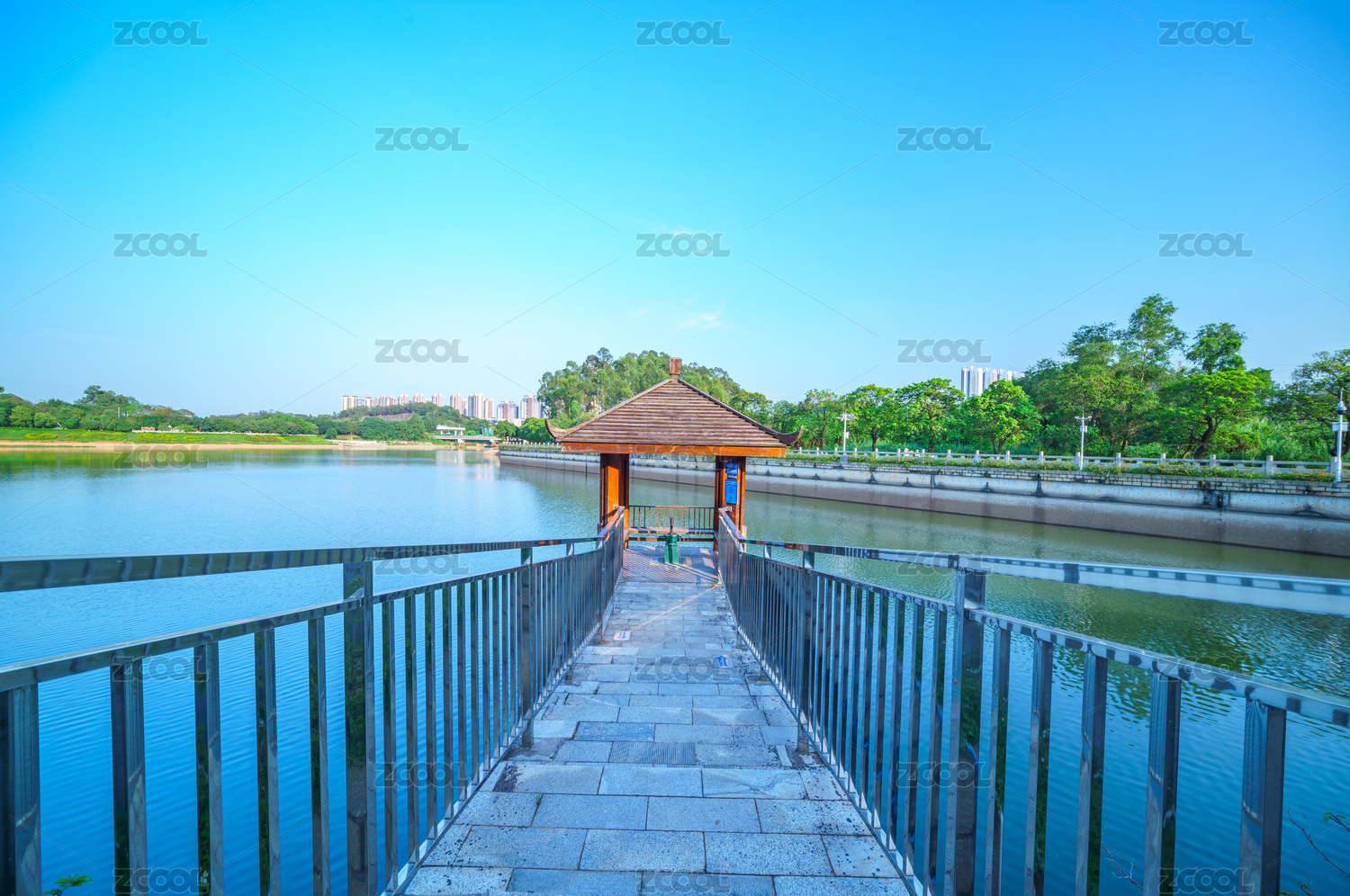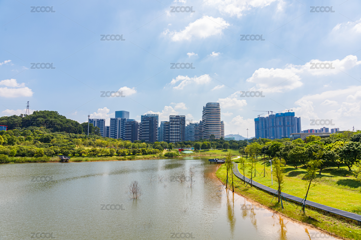 中国广东省佛山市南海区,蓝天白云下的千灯湖公园