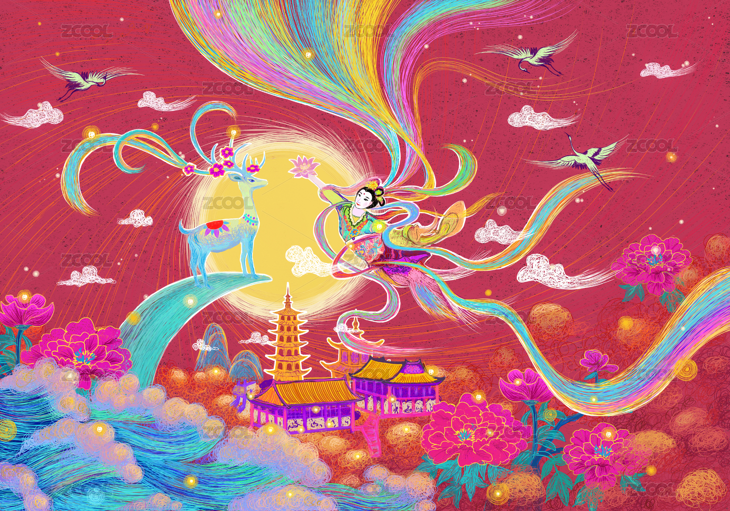 国风节日飞天仙女奇幻场景