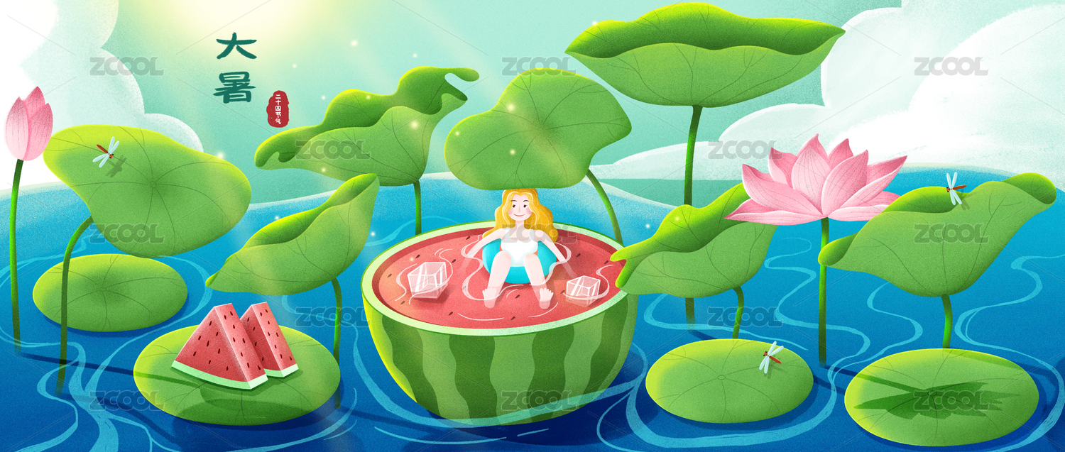 夏日荷花与泡在西瓜汁里面游泳的女孩