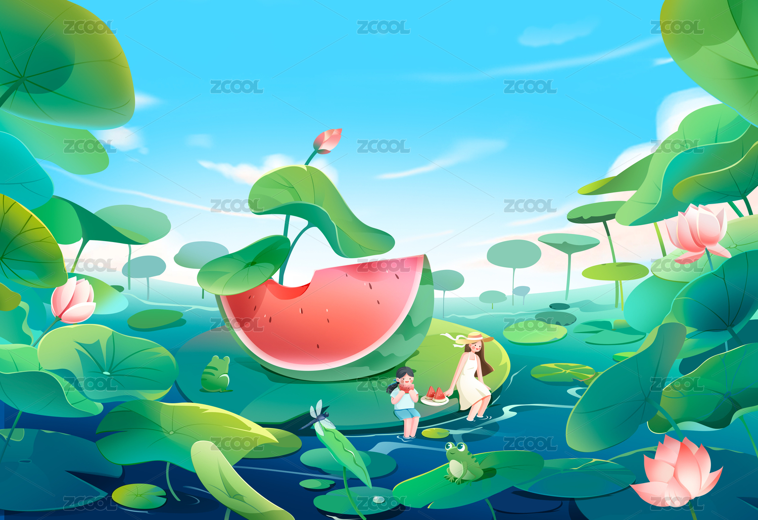 荷叶上的小女孩吃西瓜