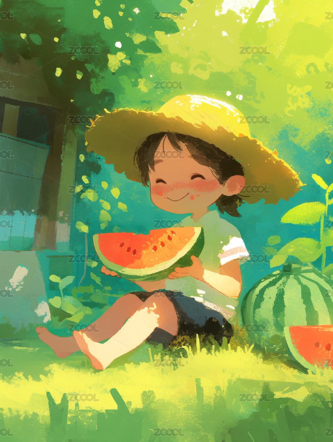 小女孩荷叶上抱着西瓜