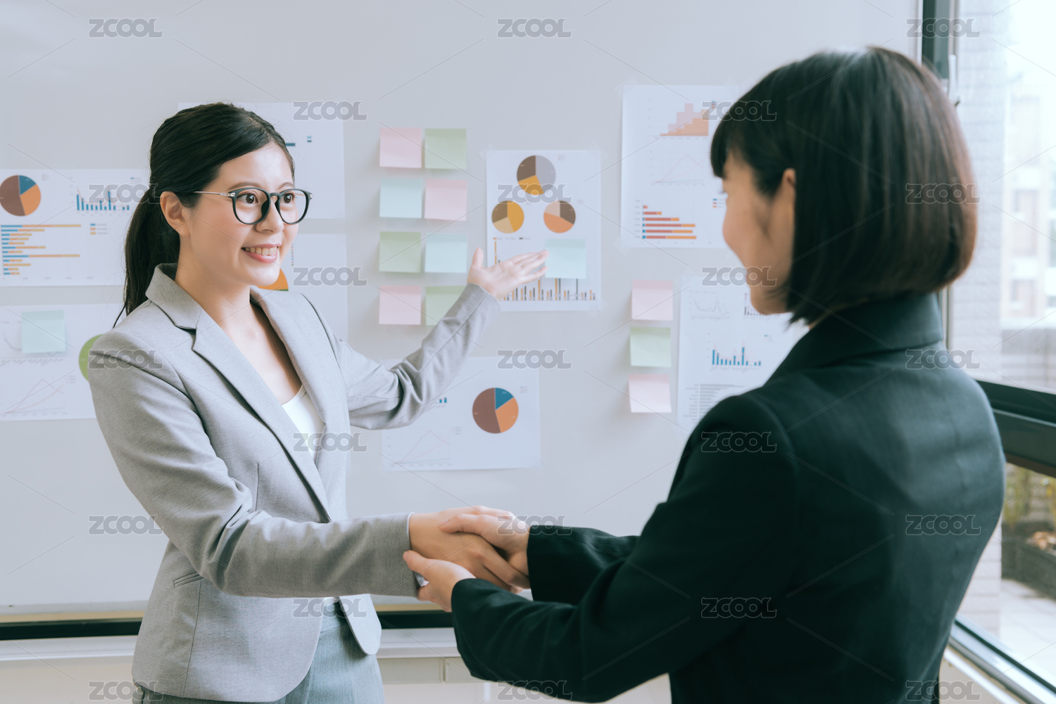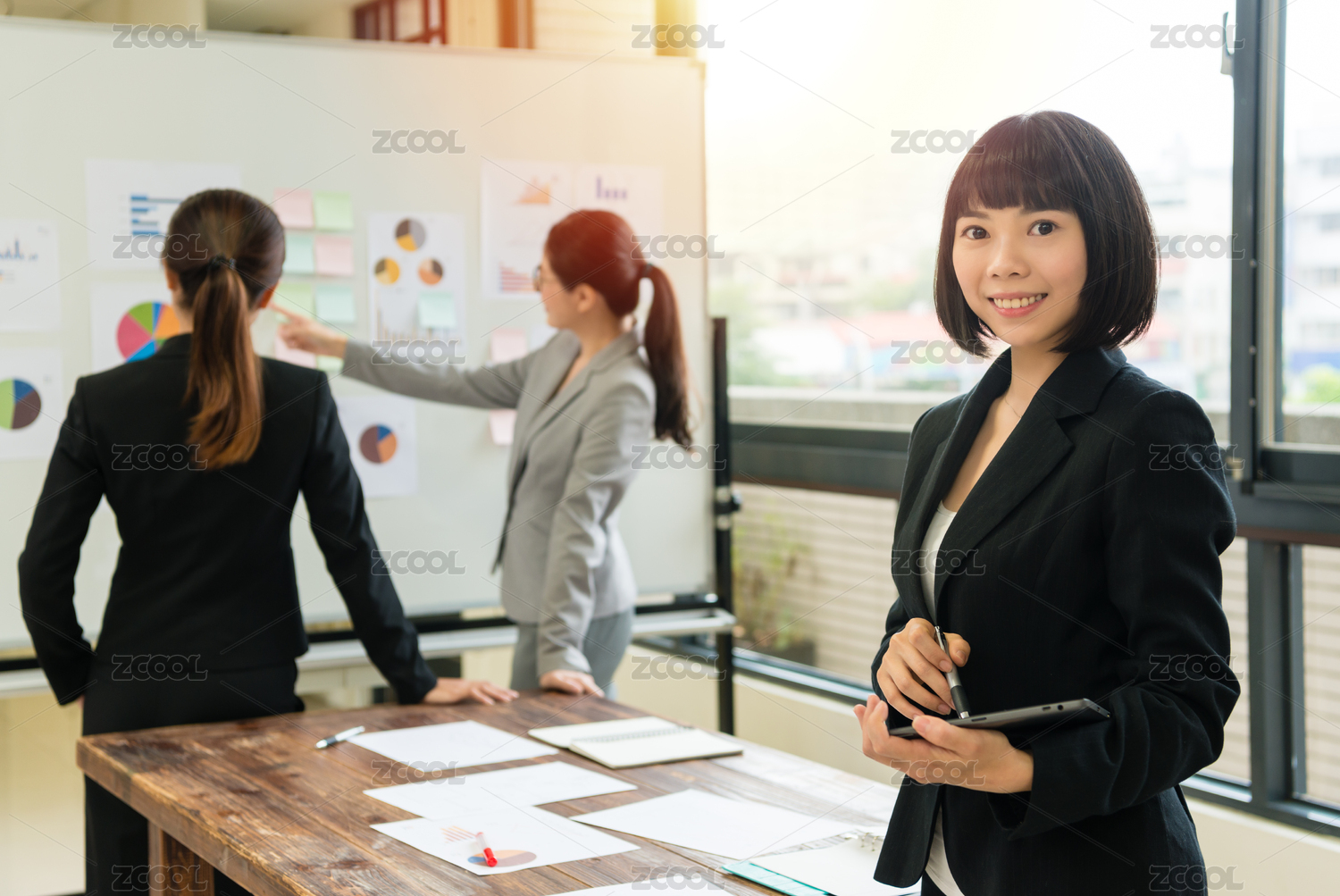2个信心亚洲办公室小姐展示在办公室的地位和横担面到相机。