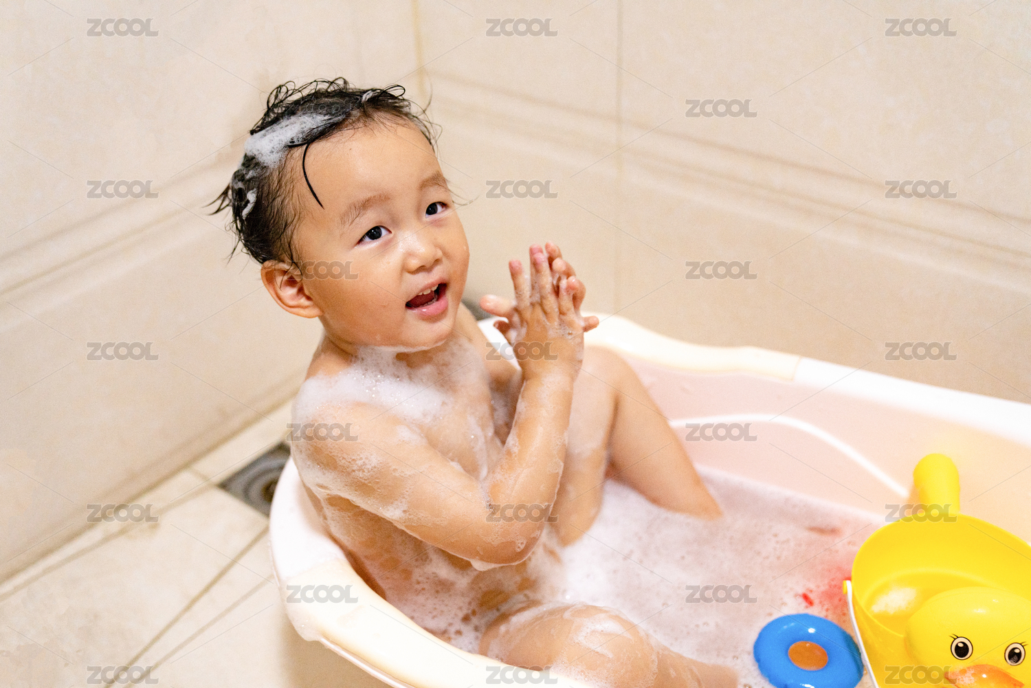 一个沐浴中的中国快乐男孩