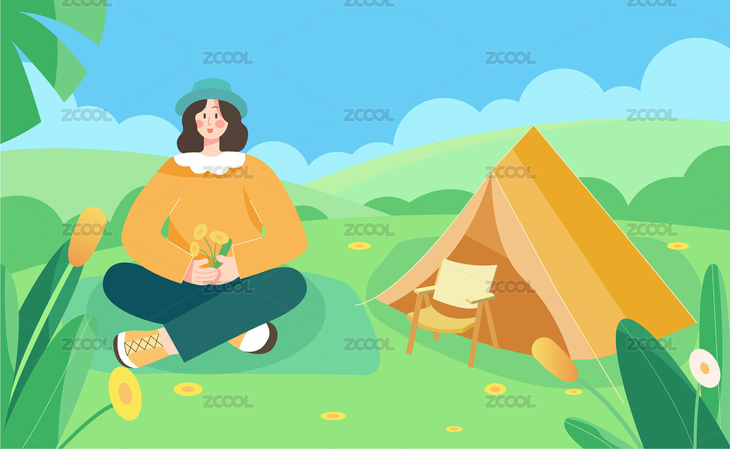 卡通可爱手绘风格扁平户外露营女生看书篝
