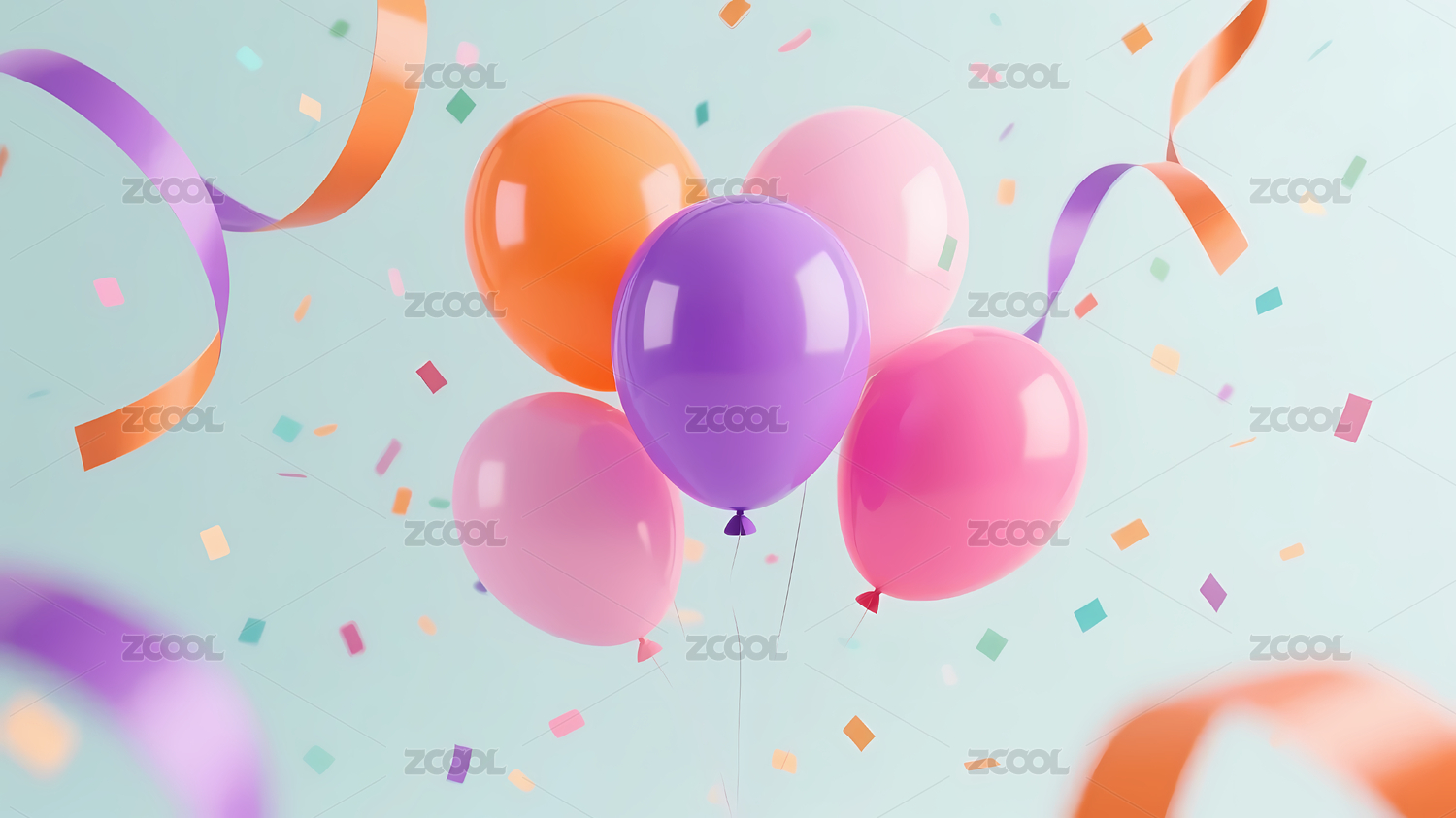 粉色背景,充满五彩纸屑彩带和粉色气球的节