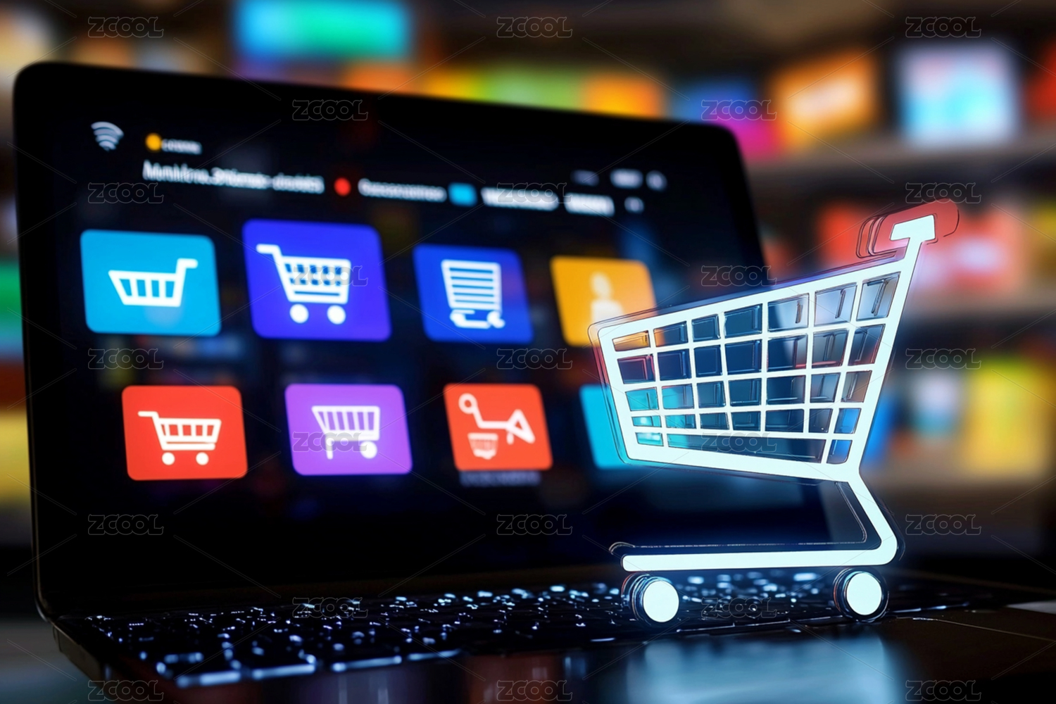 笔记本电脑与购物车线上购物概念背景