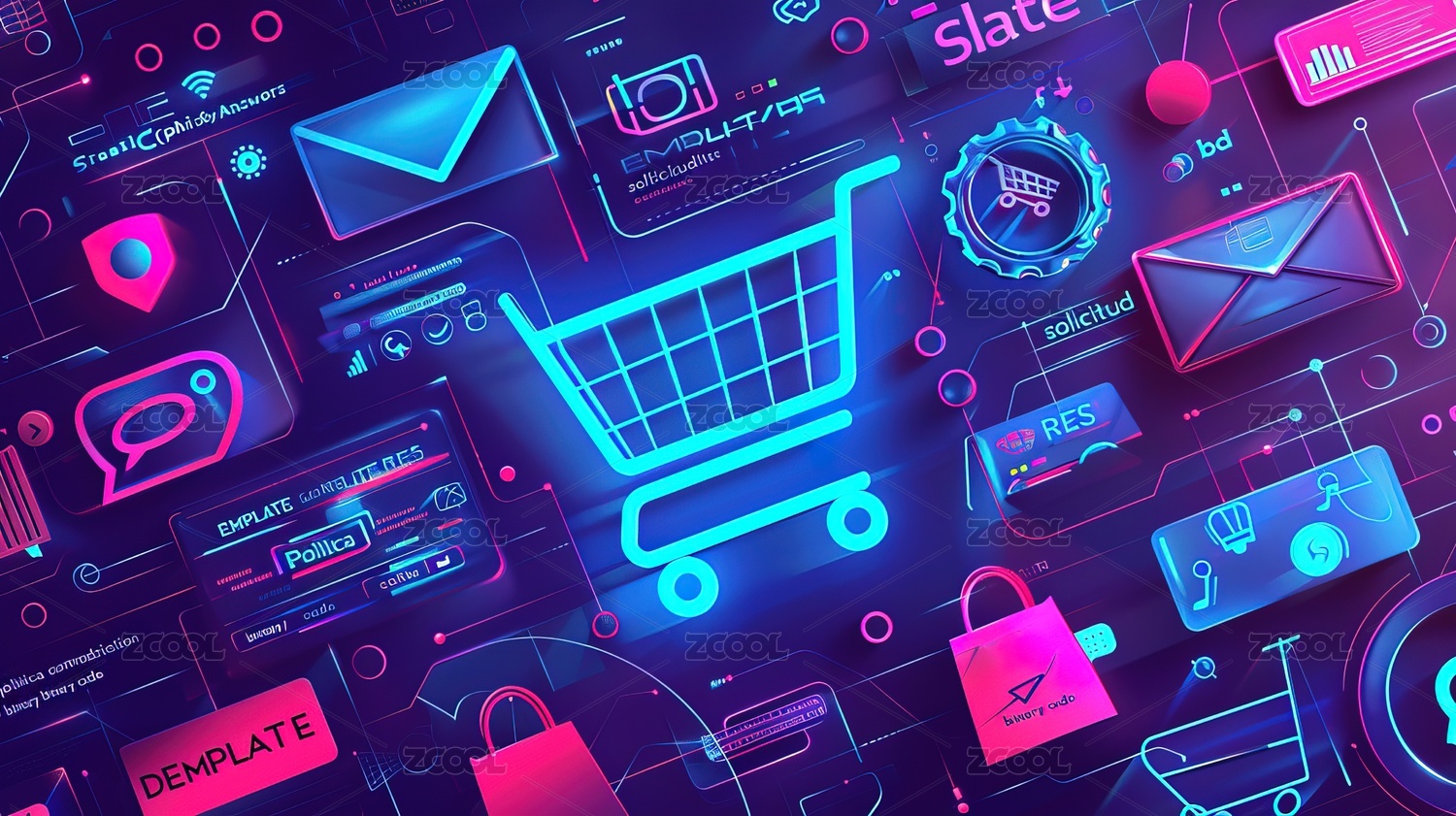 炫彩霓虹电子商务购物图标在黑色背景上展示