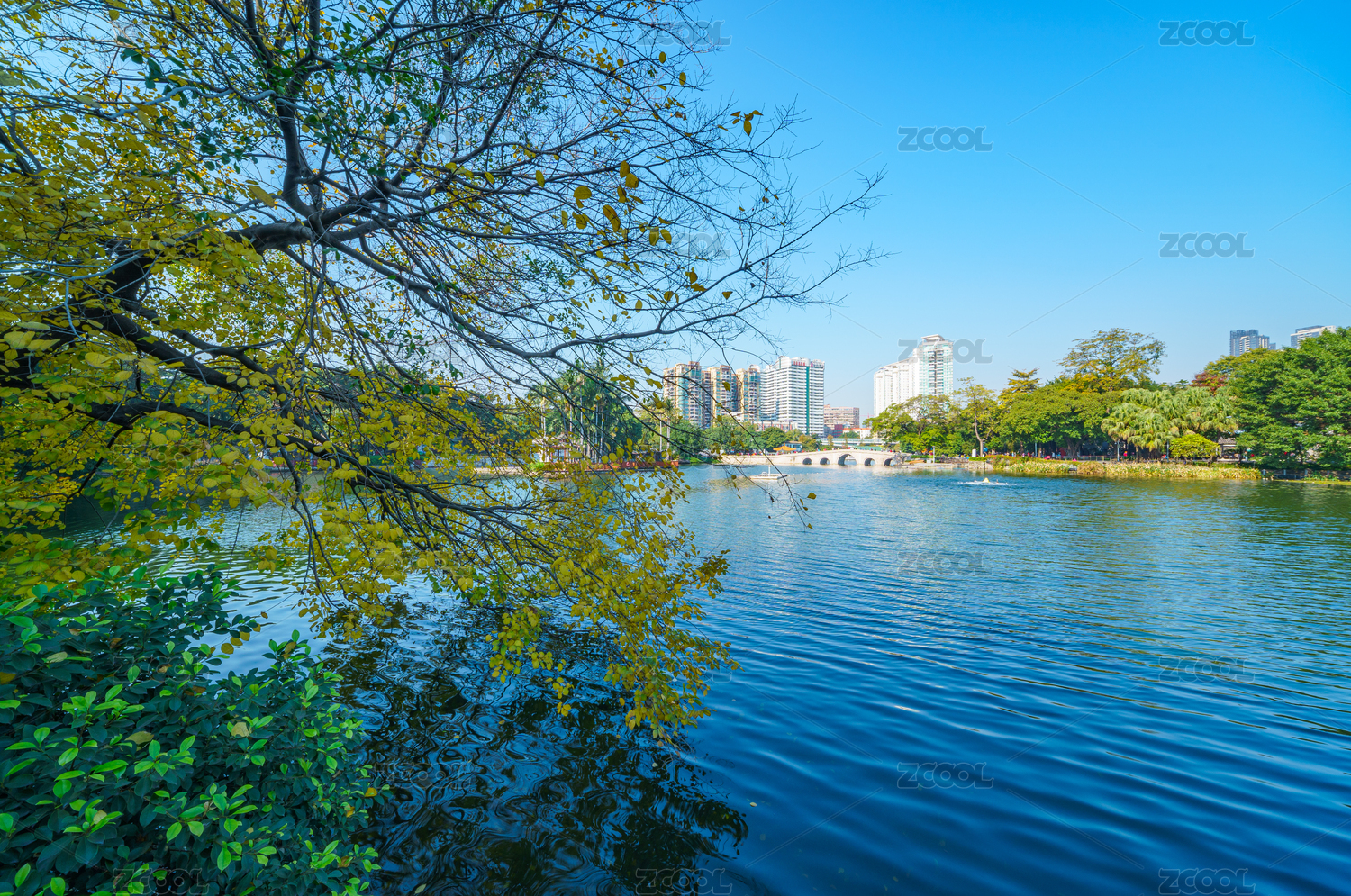 广州流花湖公园湖景豪宅城市高楼建筑