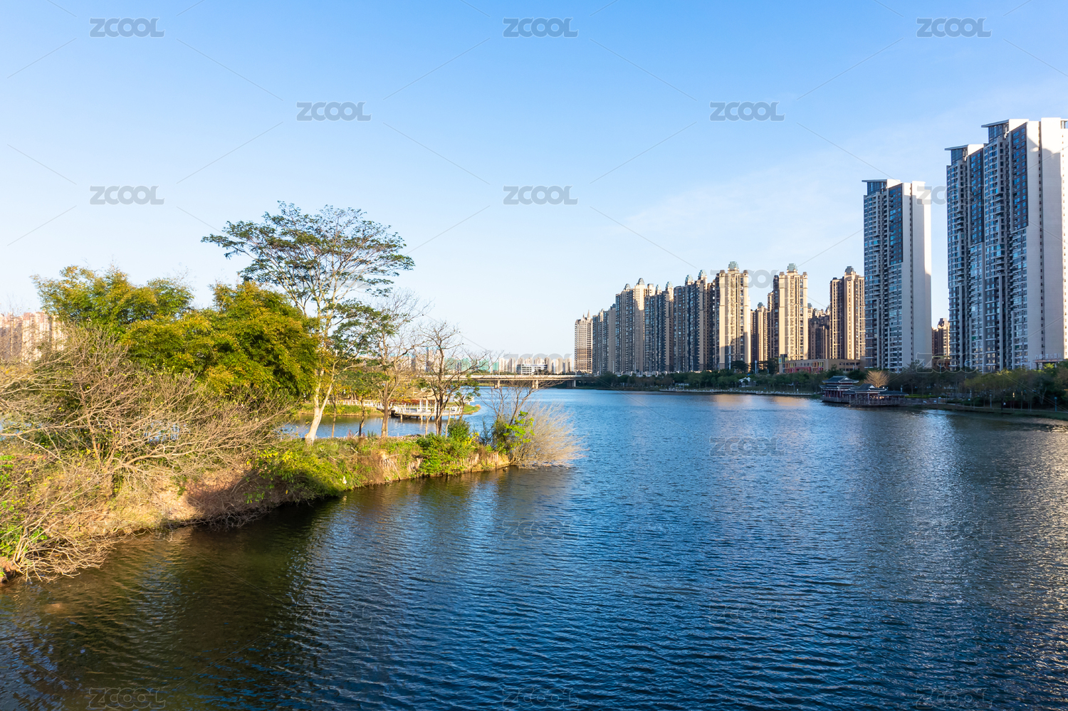 美丽的河畔水岸高层住宅小区环境背景素材