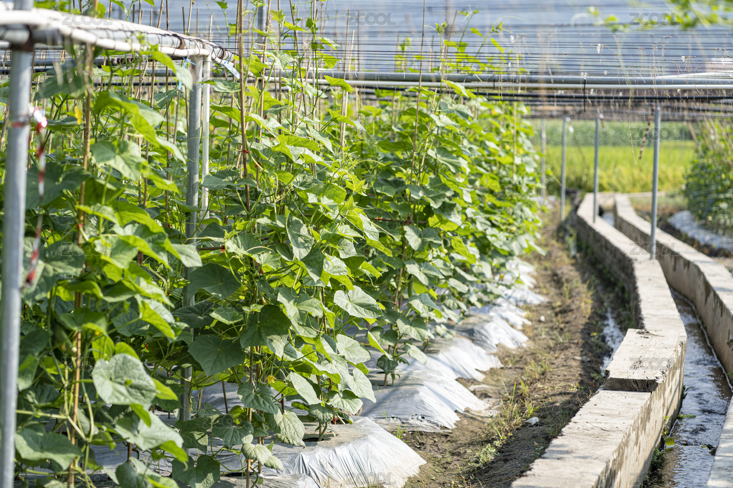 搭棚架种植的生长旺盛的黄瓜植株