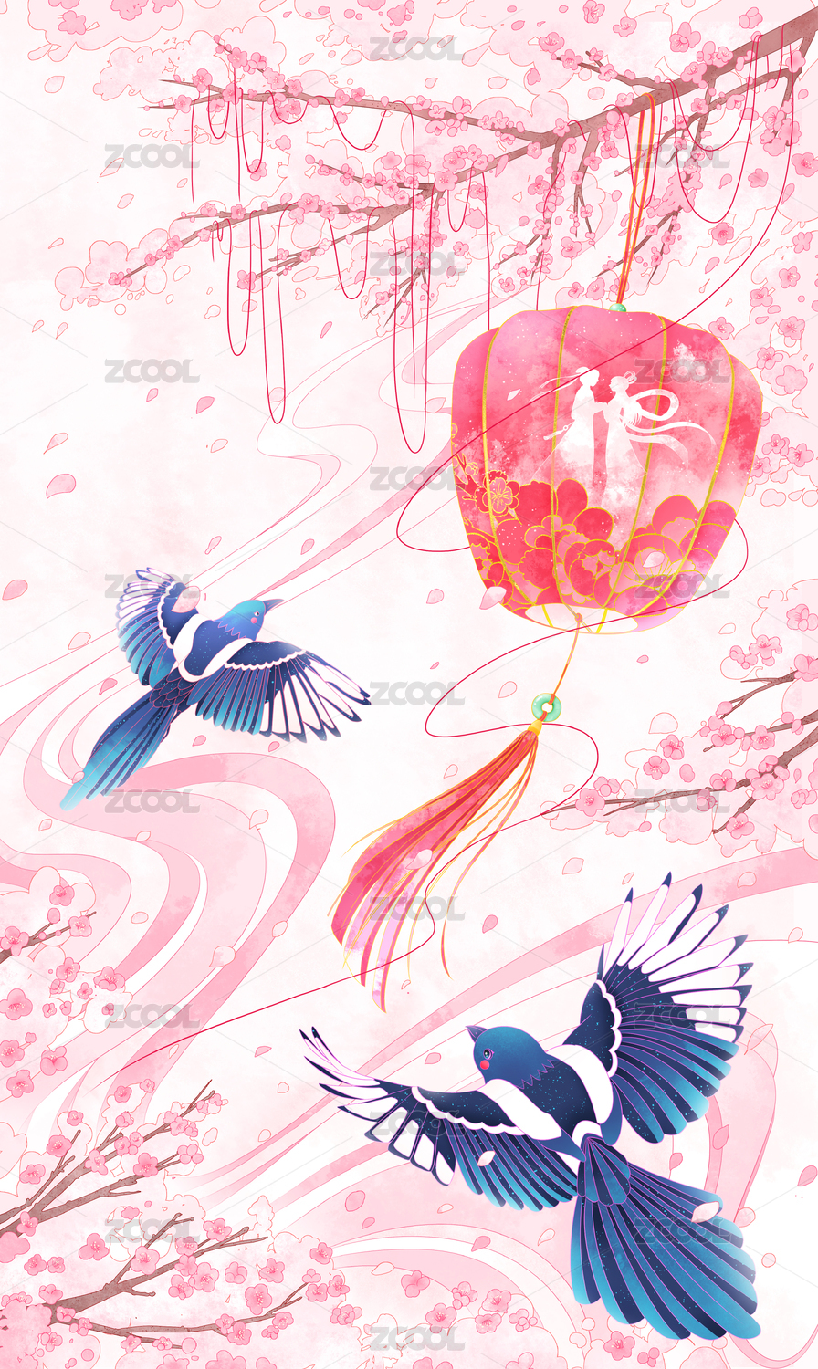 七夕花灯挂在开满花的树枝上喜鹊从枝头飞过