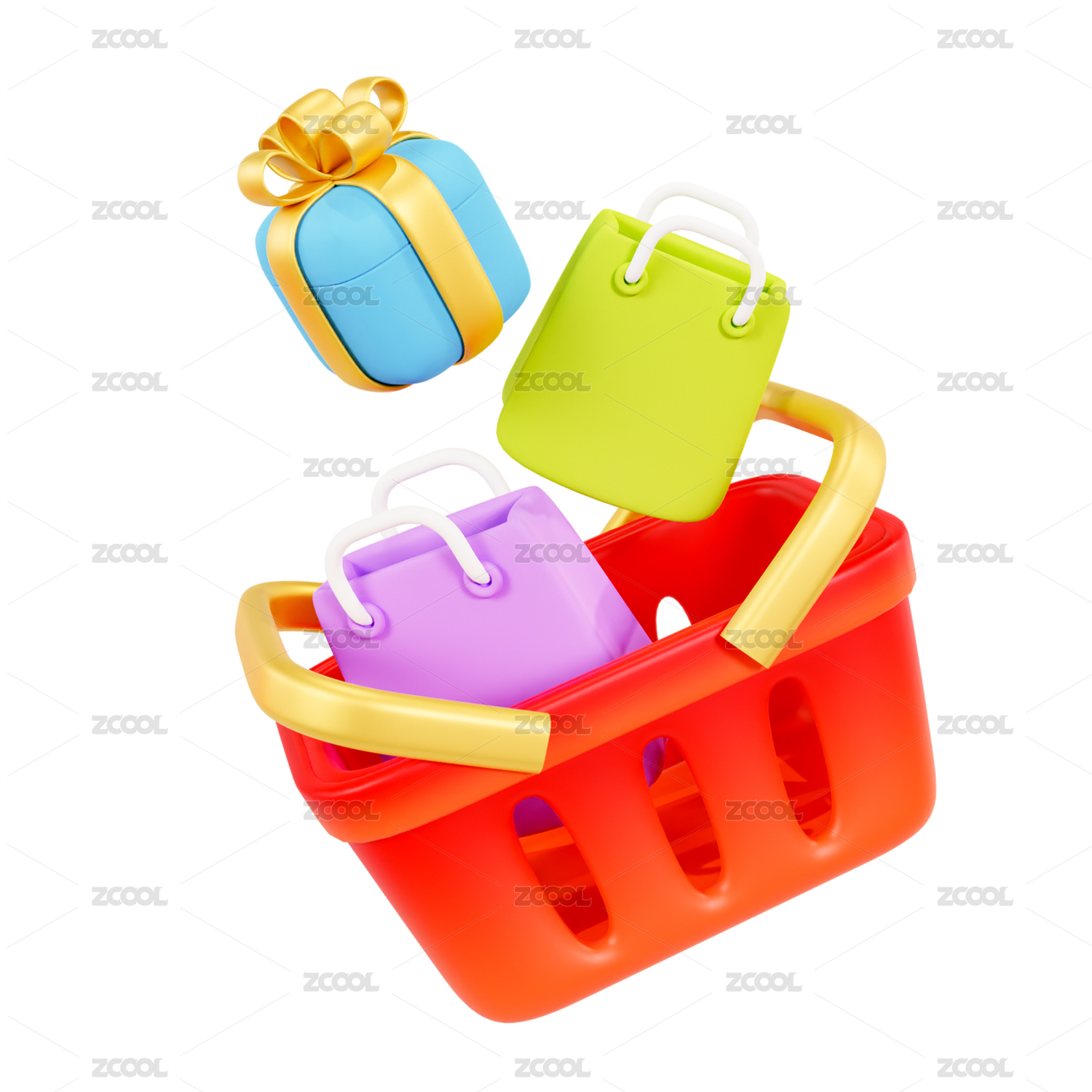 3D渲染的装着礼盒购物袋的购物篮电商元素