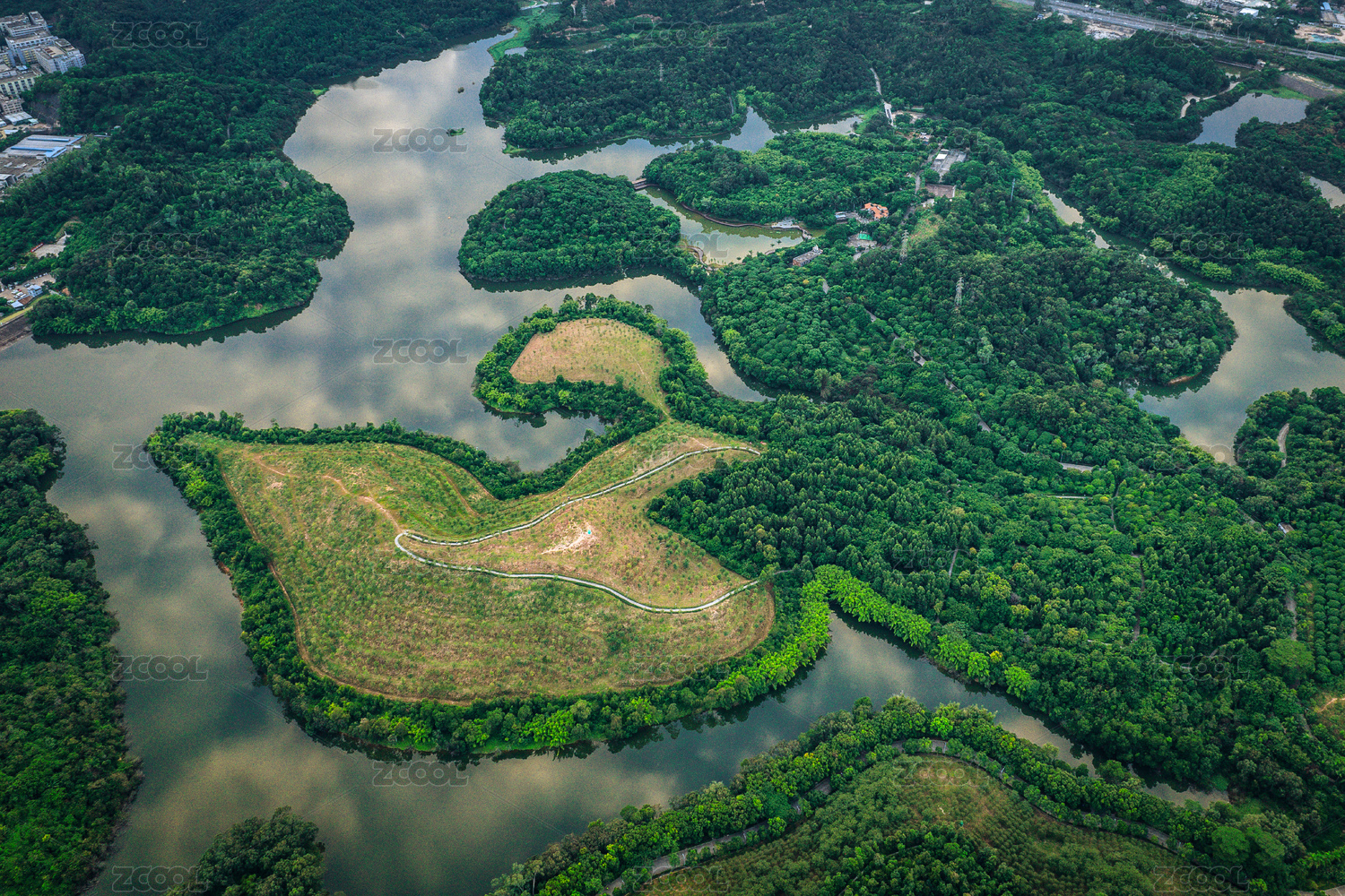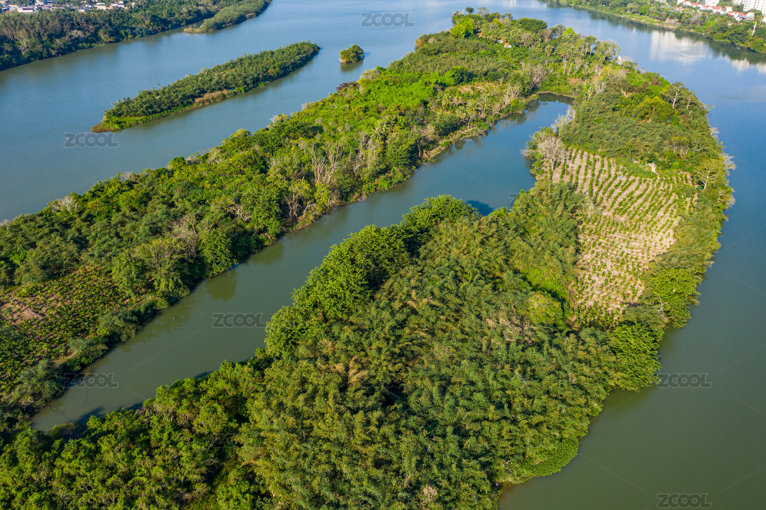 航拍郁郁葱葱的岛屿与河流