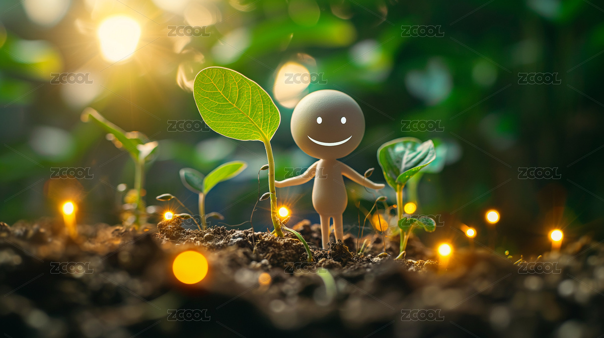 一个小人偶正在浇花种树