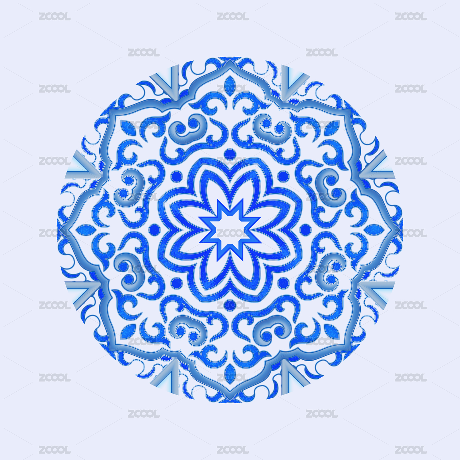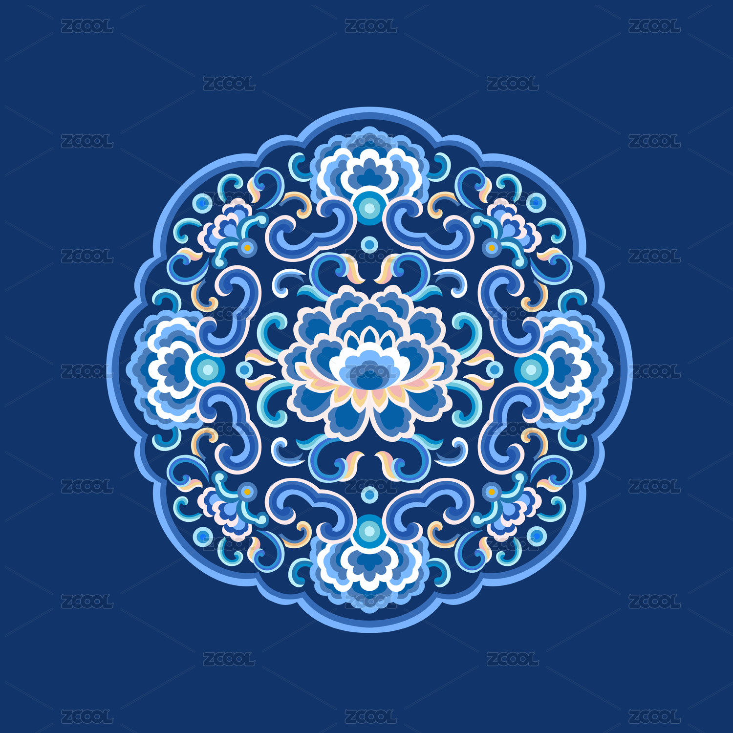 古典传统的蓝色圆形花纹装饰图案,蓝色背景