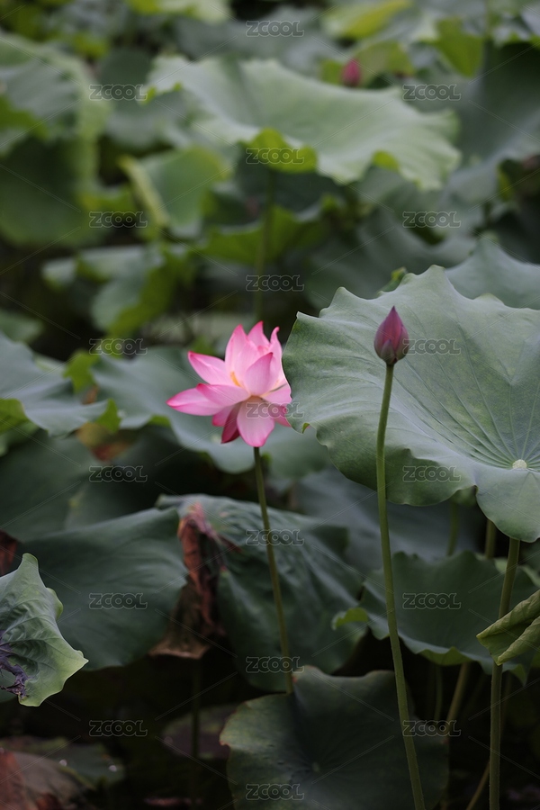 夏季公园荷塘荷叶丛中荷花特写