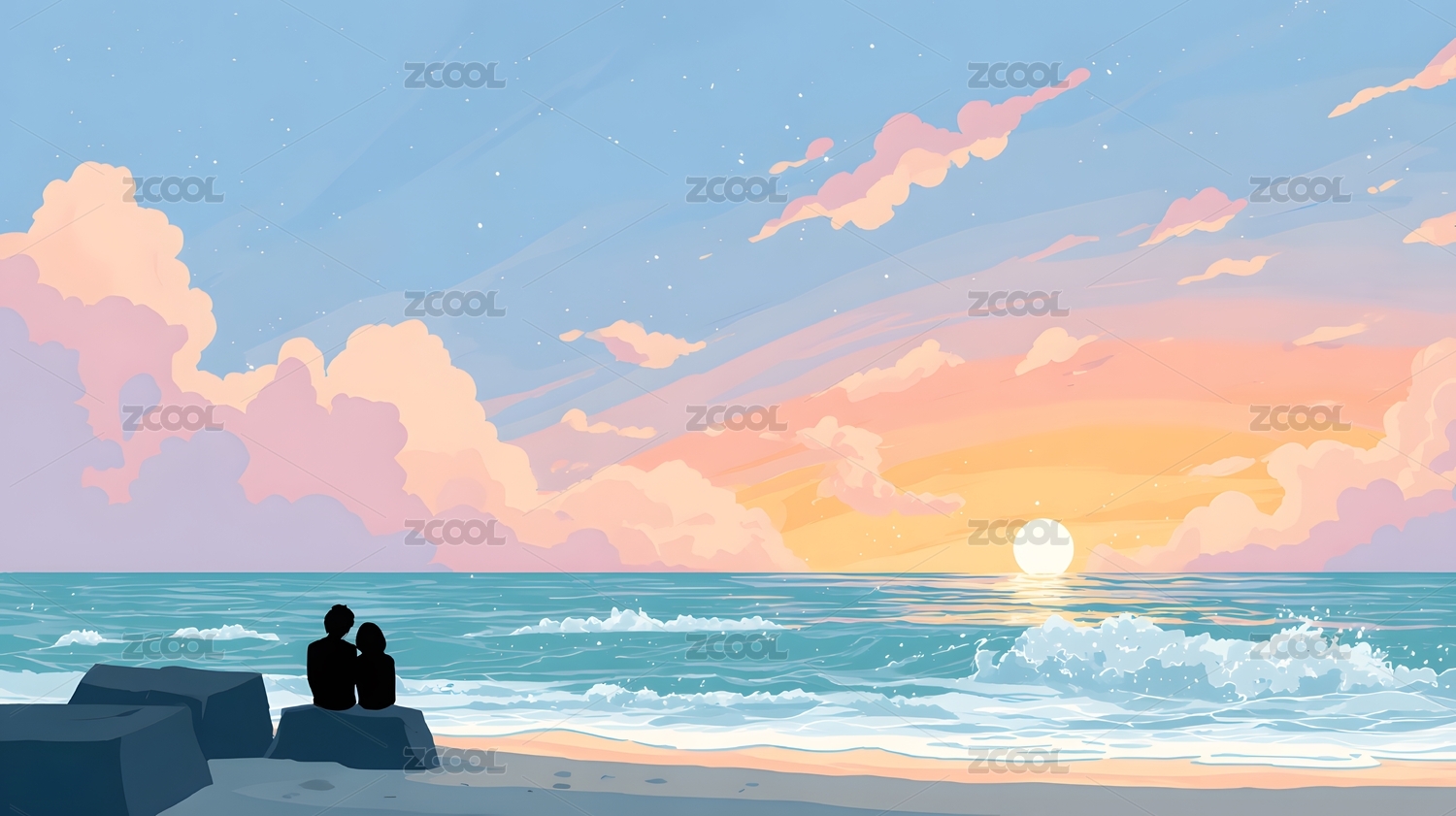 老人小孩看海上日出日落剪影陪伴亲情温馨