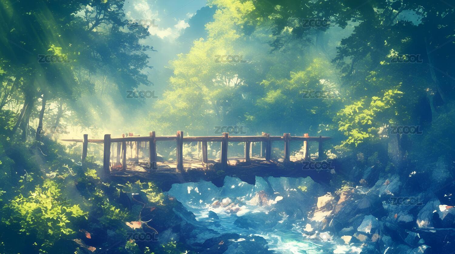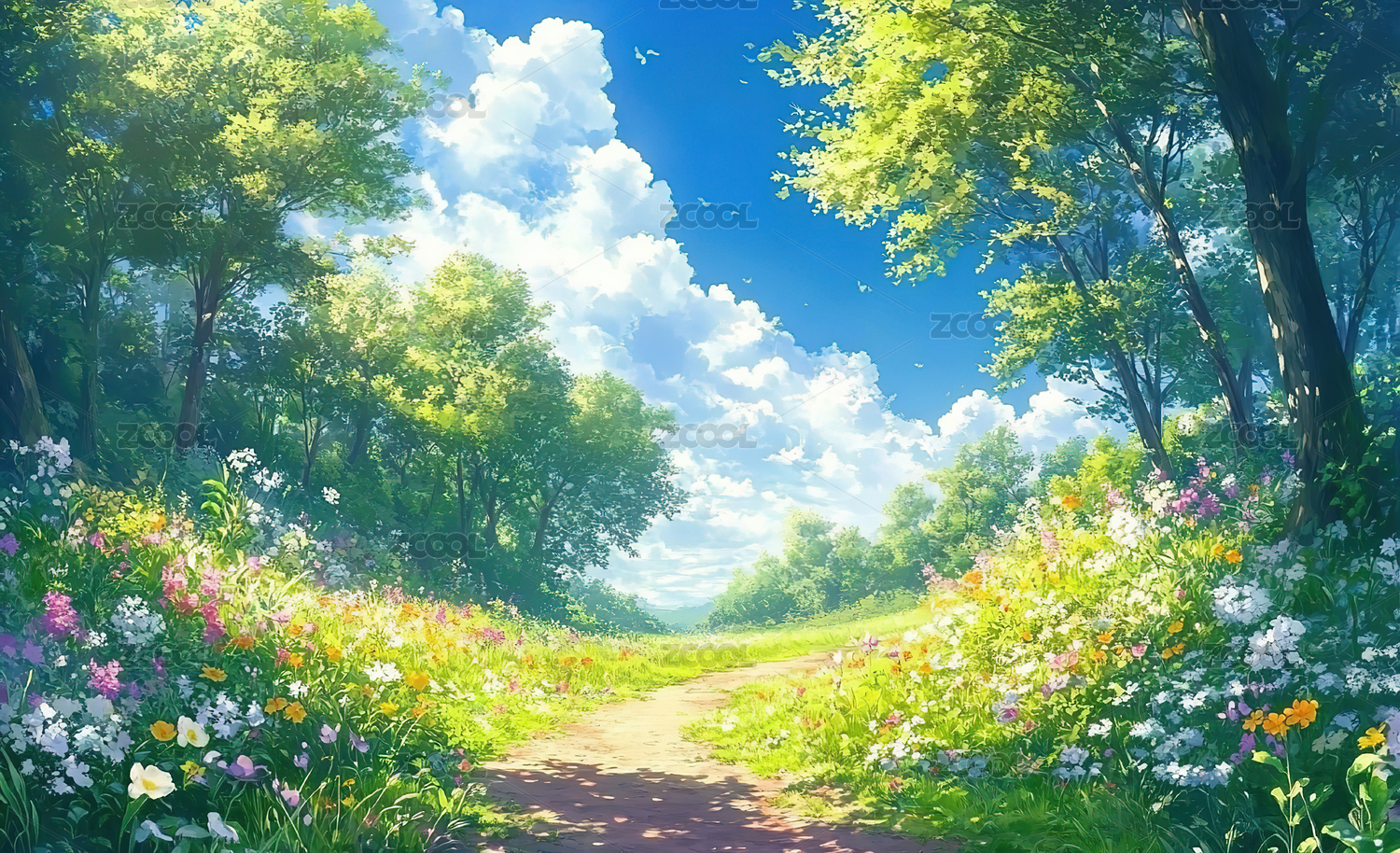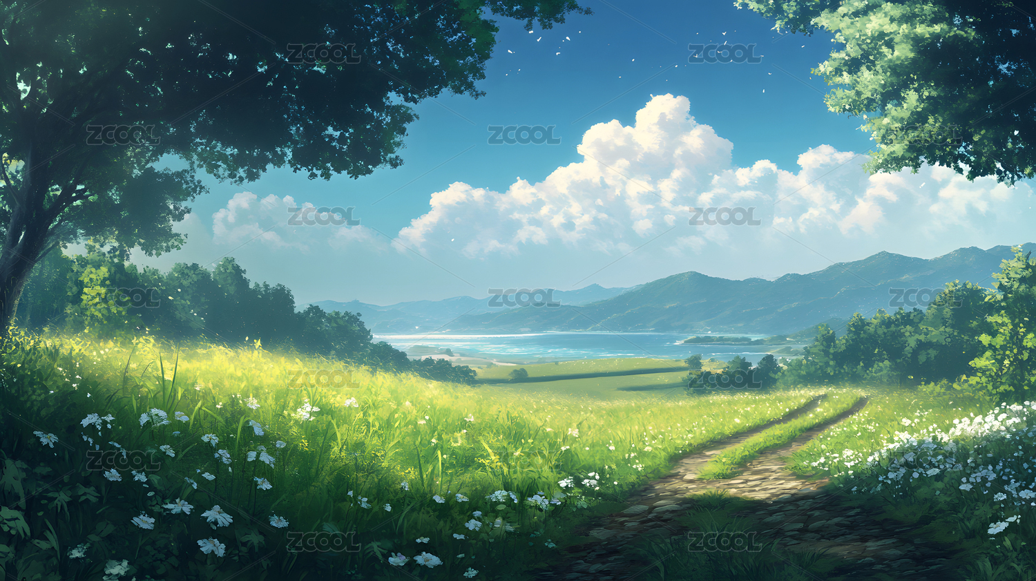 治愈系童话绘本风格郊外绿色的风景壁纸