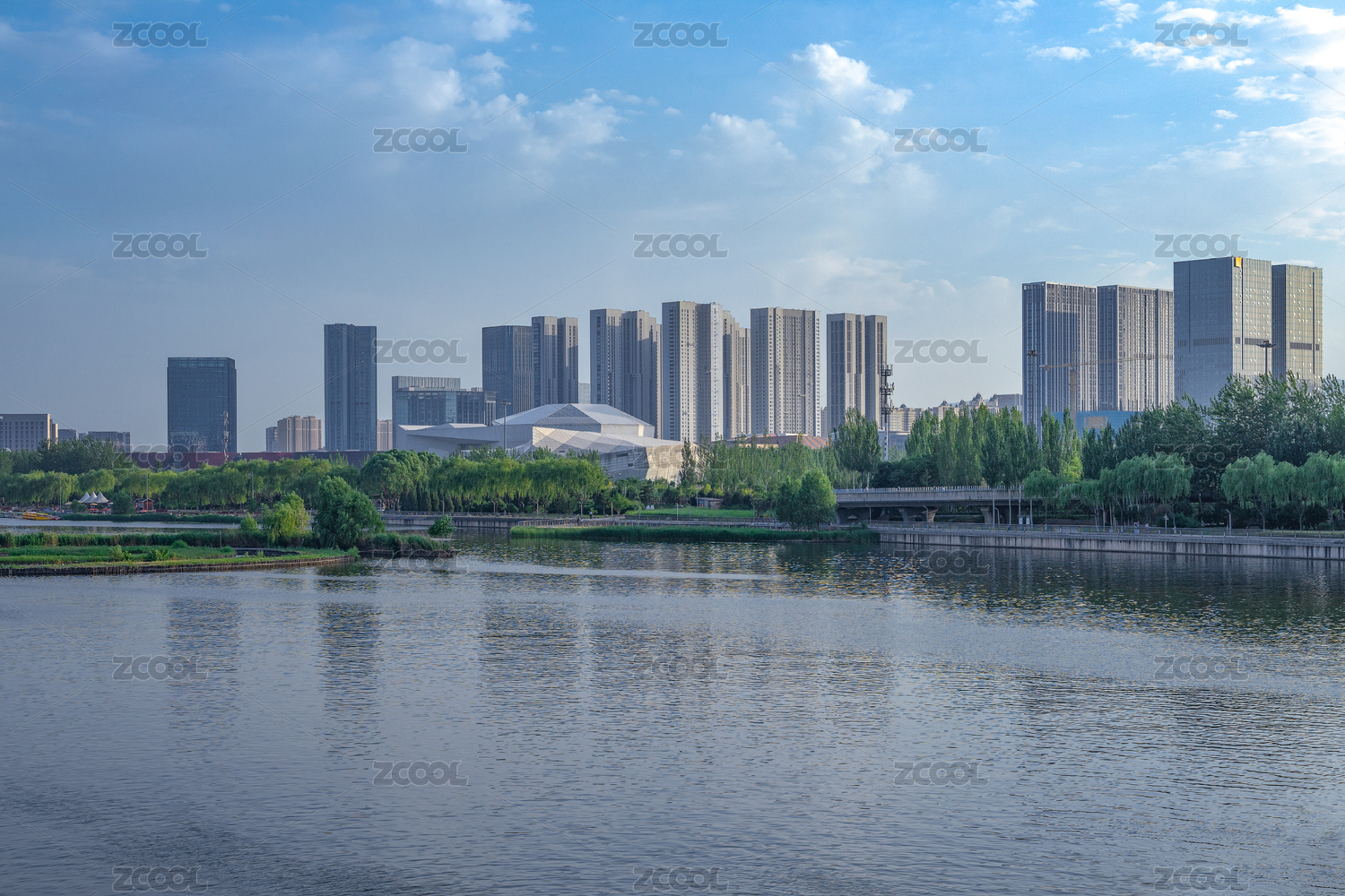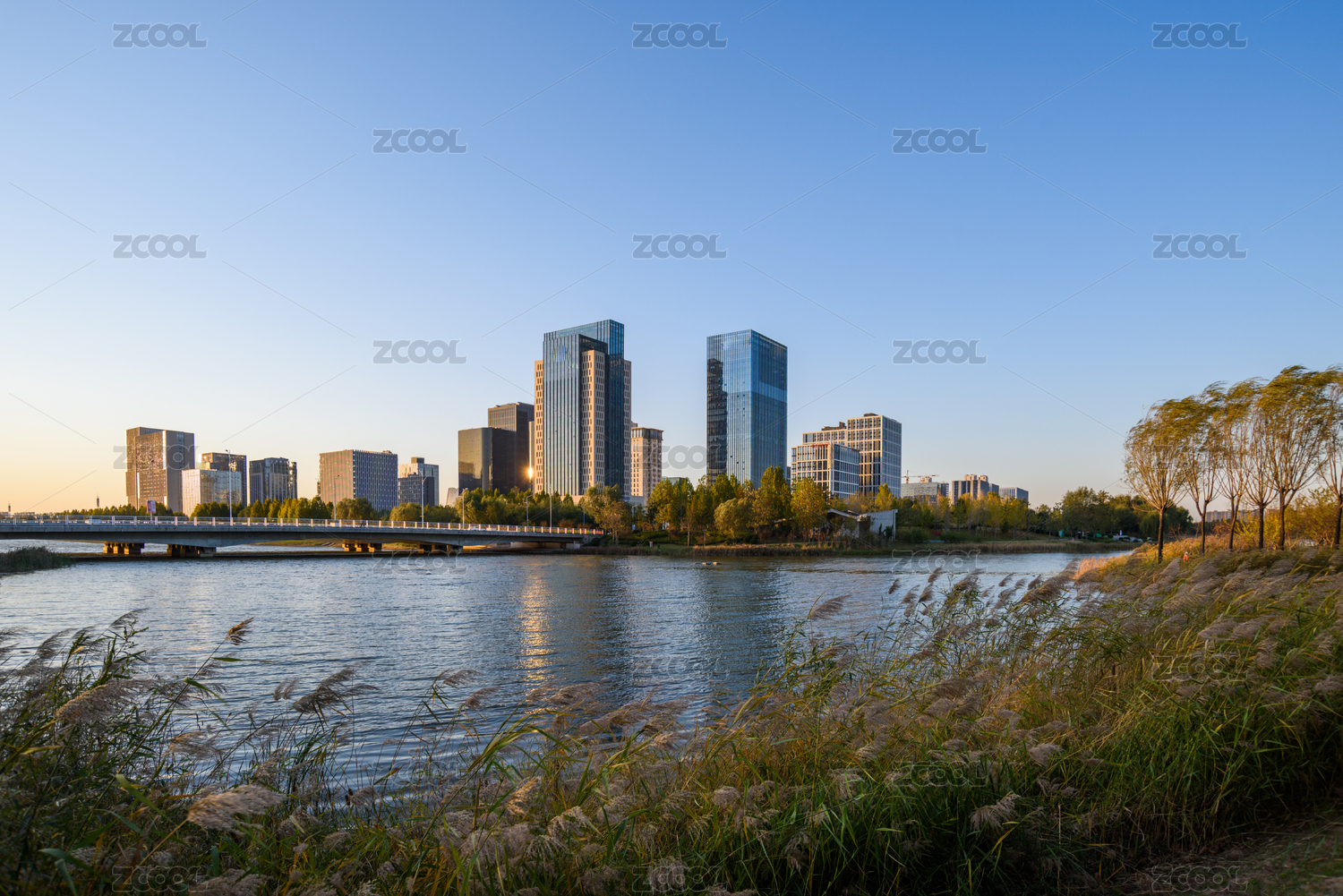晴朗天气蓝天下中国北京通惠河畔CBD现代建筑及河里的倒影