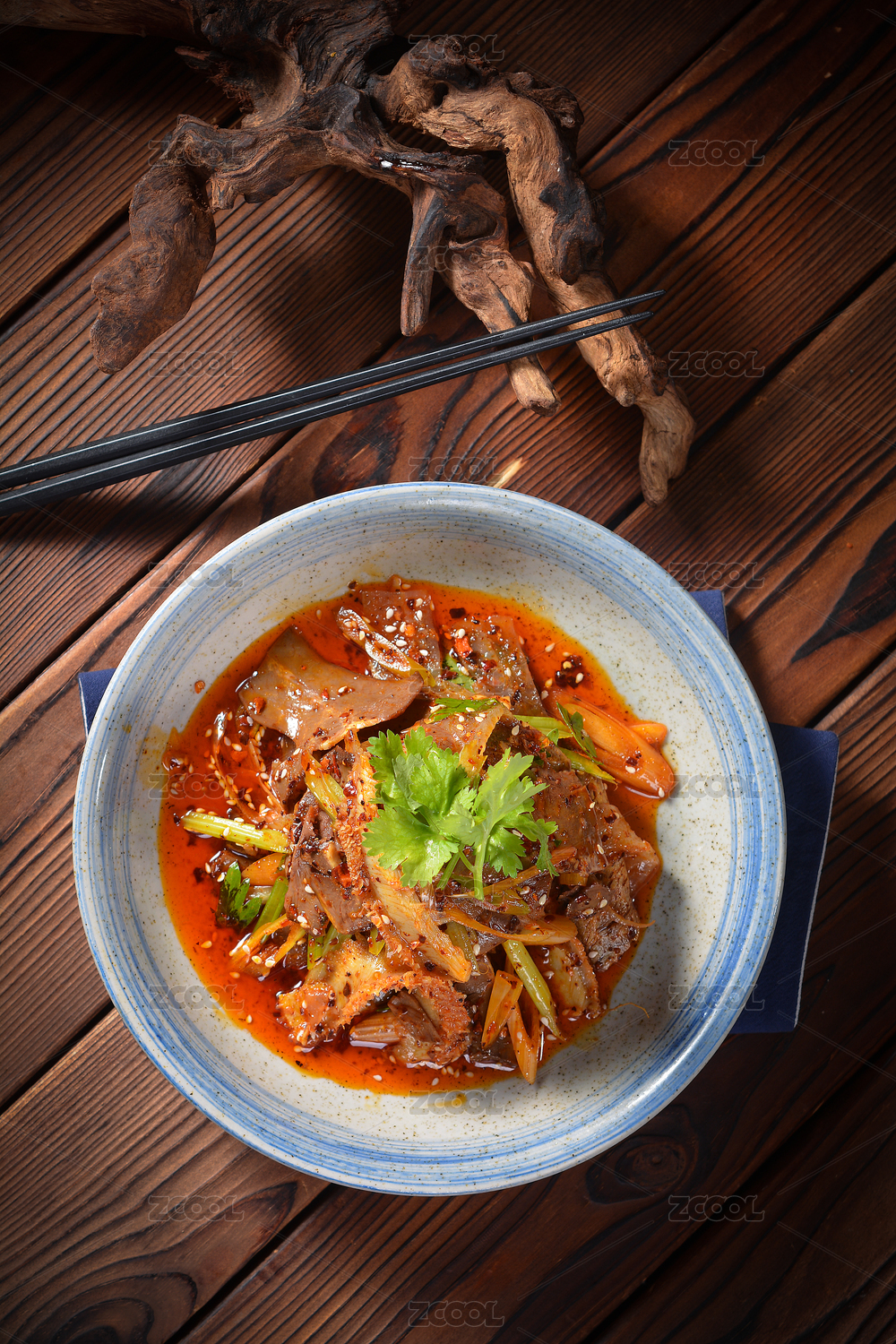圆形瓷盘装的红油肚丝摆放在寿司帘上