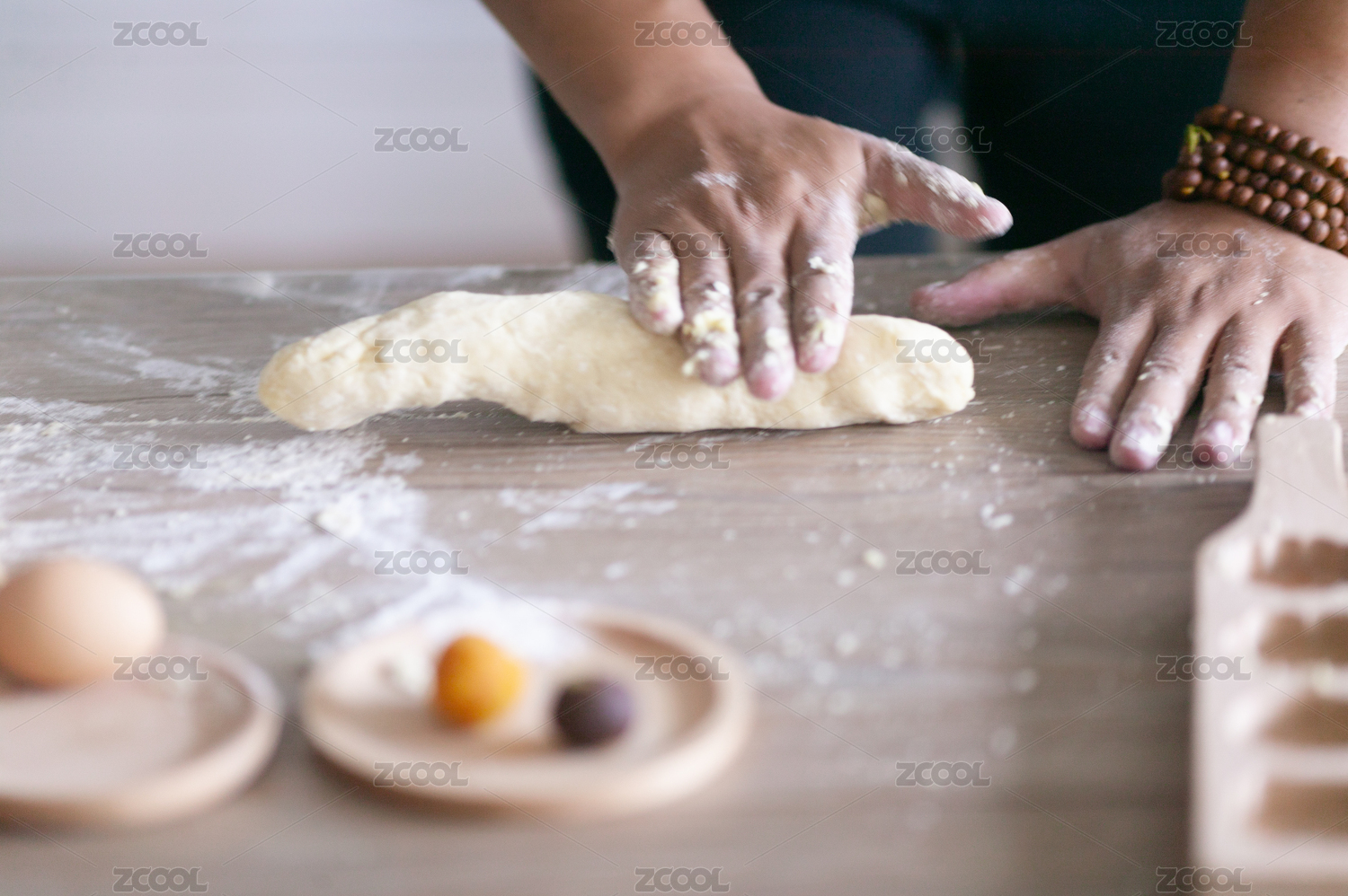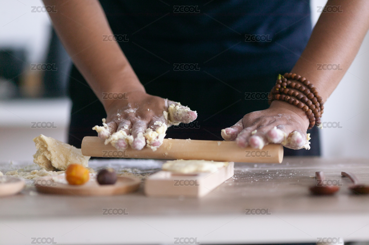 木桌子上用月饼模具,擀面杖等手工制作月饼