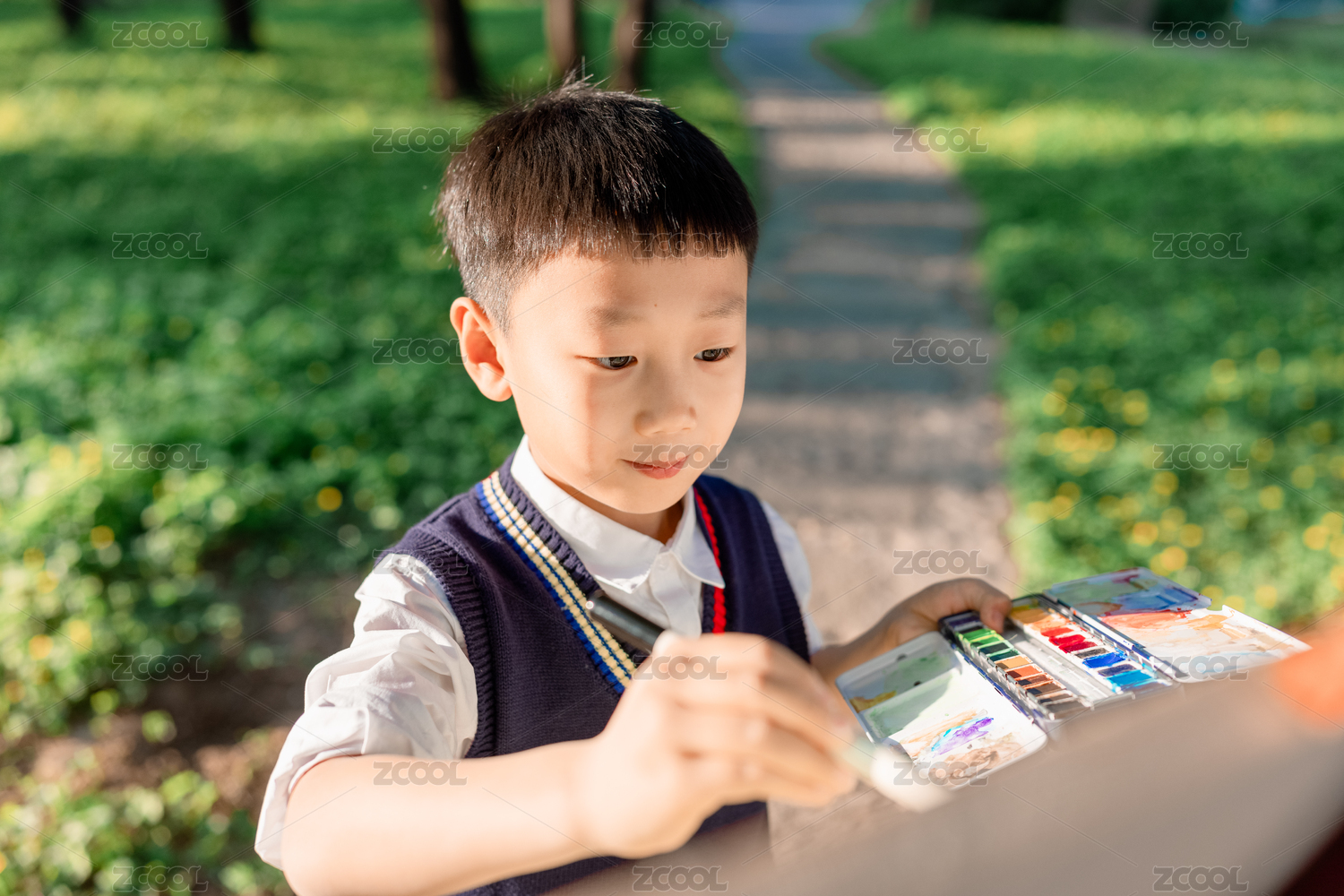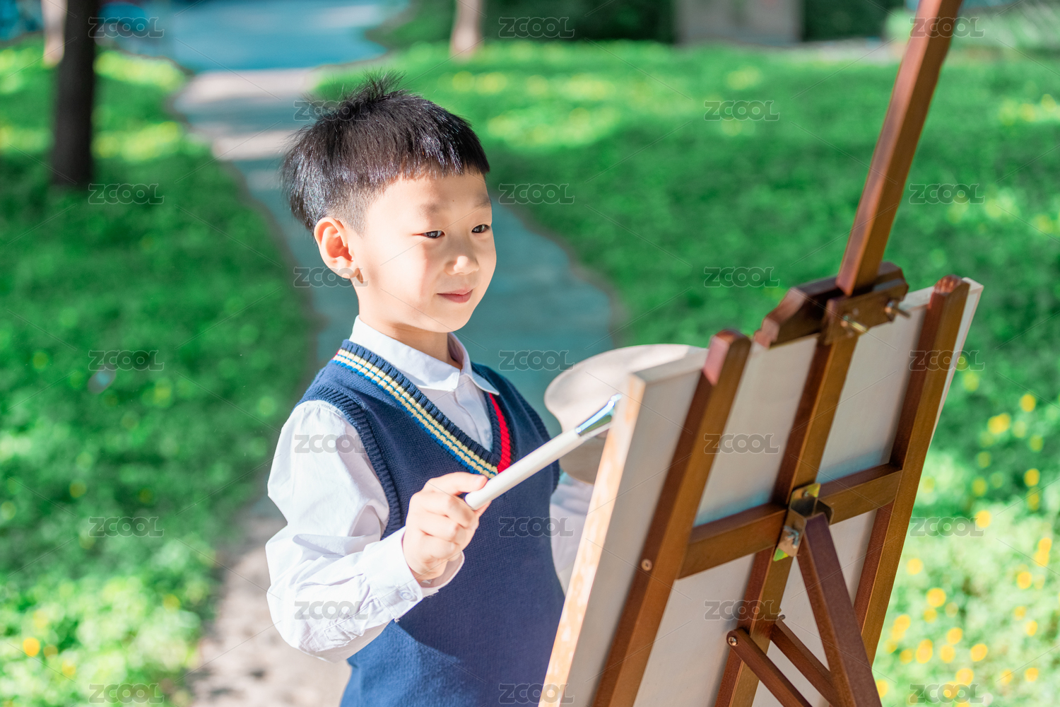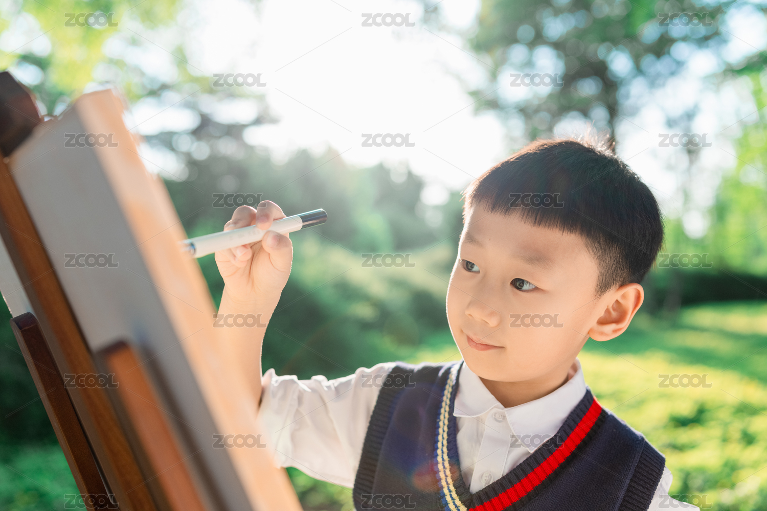 春天户外亚洲中国男孩手拿画笔在画板上画画