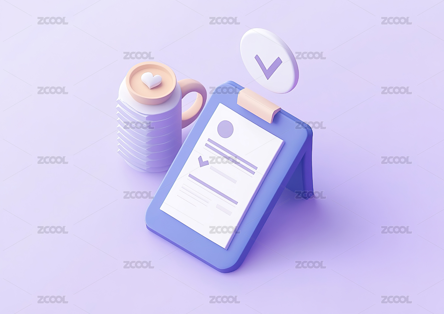 紫色背景上的咖啡杯和数字平板电脑的高角度