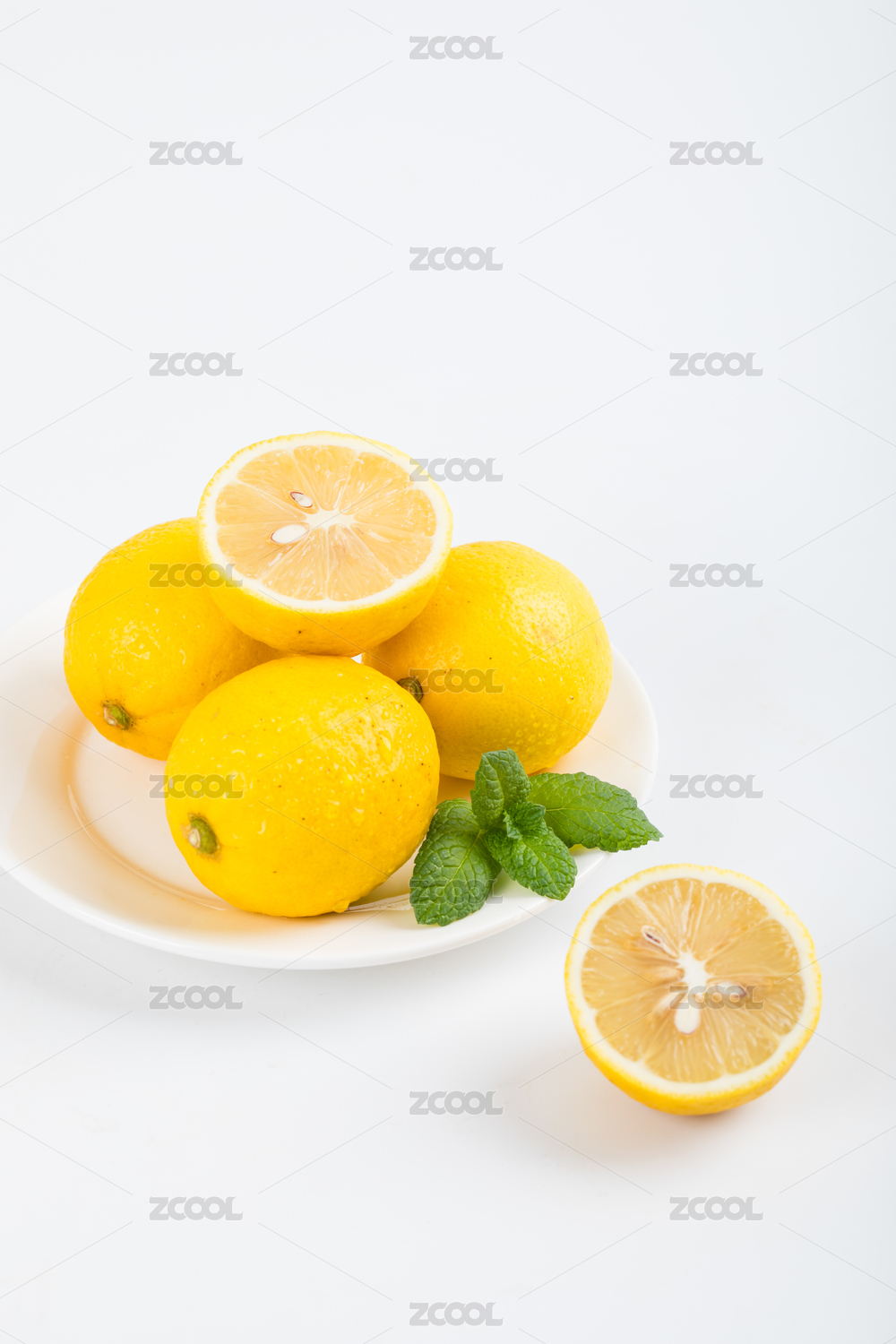 白色背景上切开的新鲜黄柠檬