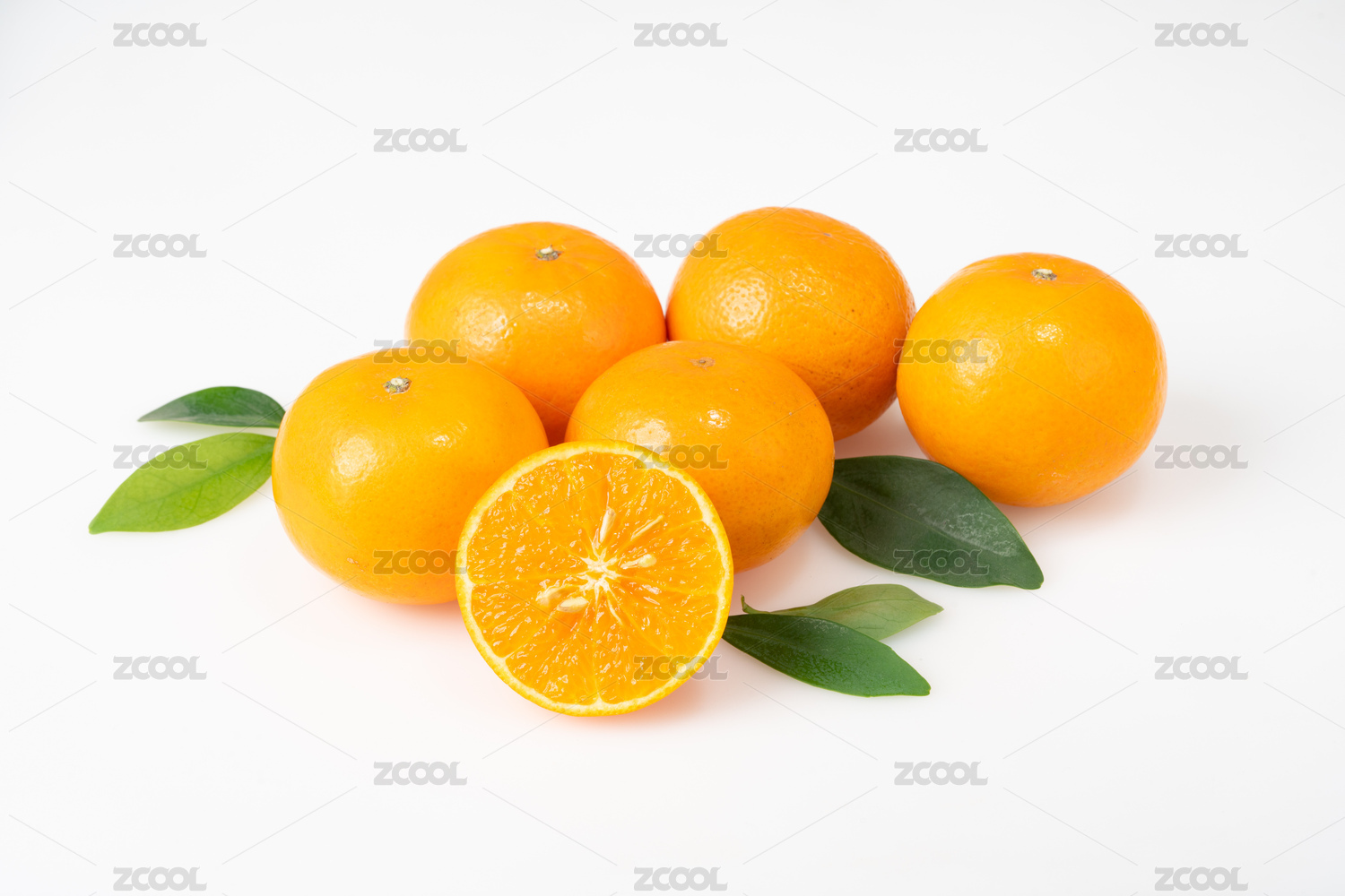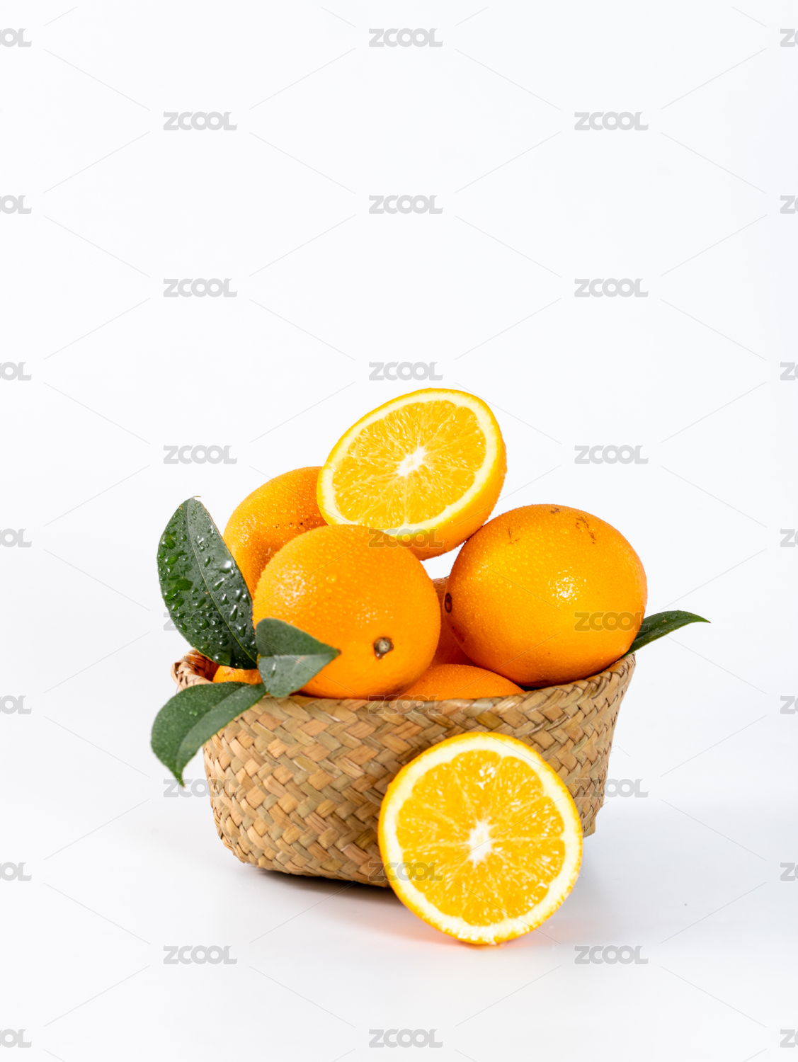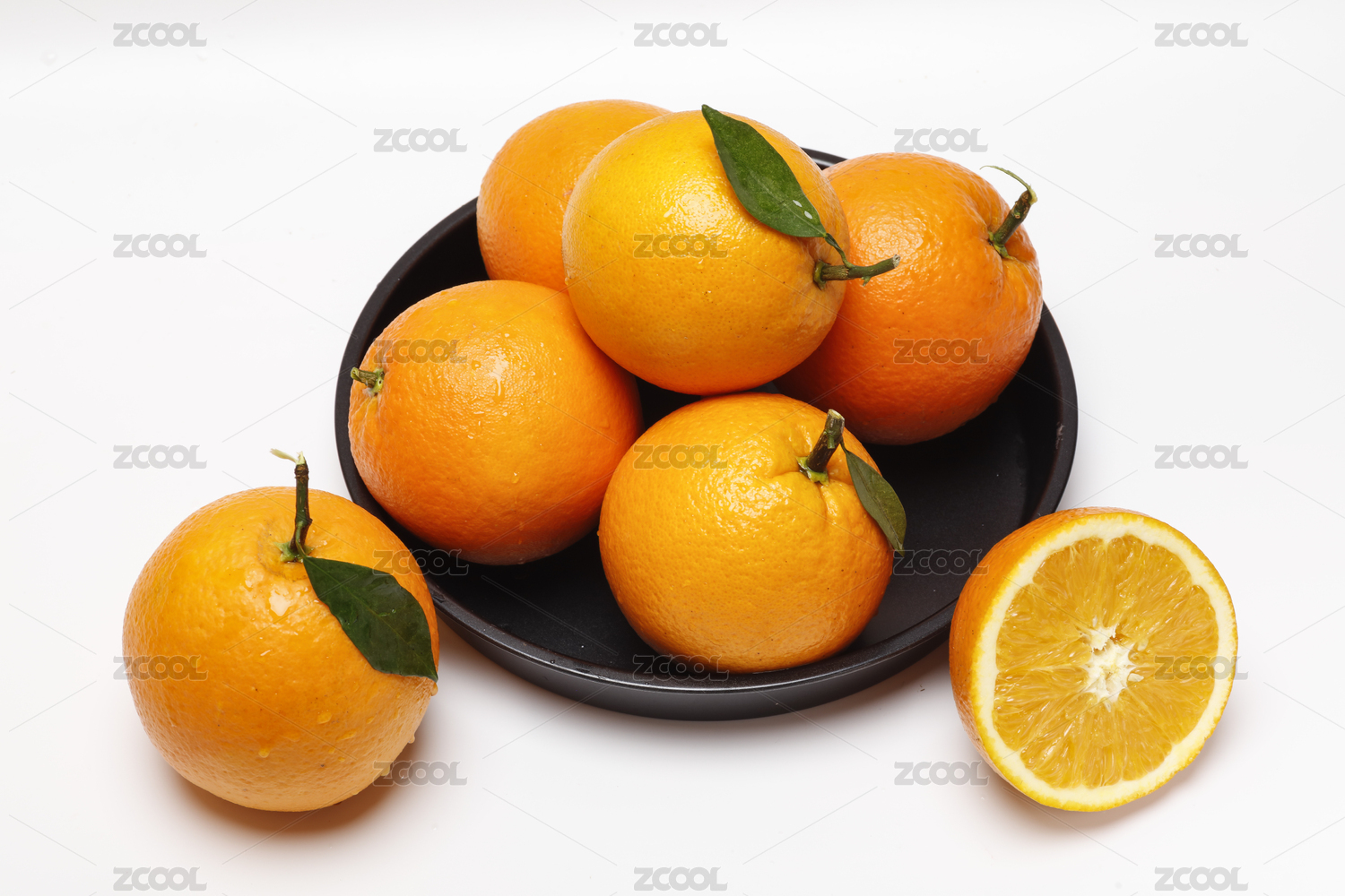 南非橙和切开果肉带绿叶子装白盘白底