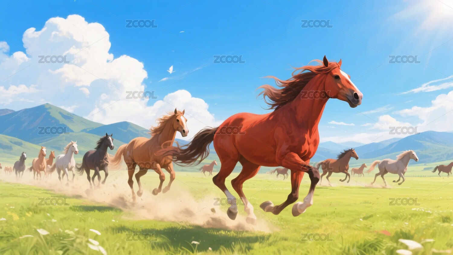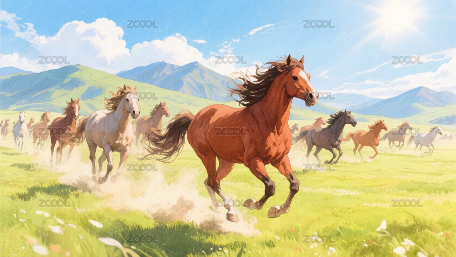 草原上群马奔腾的插画