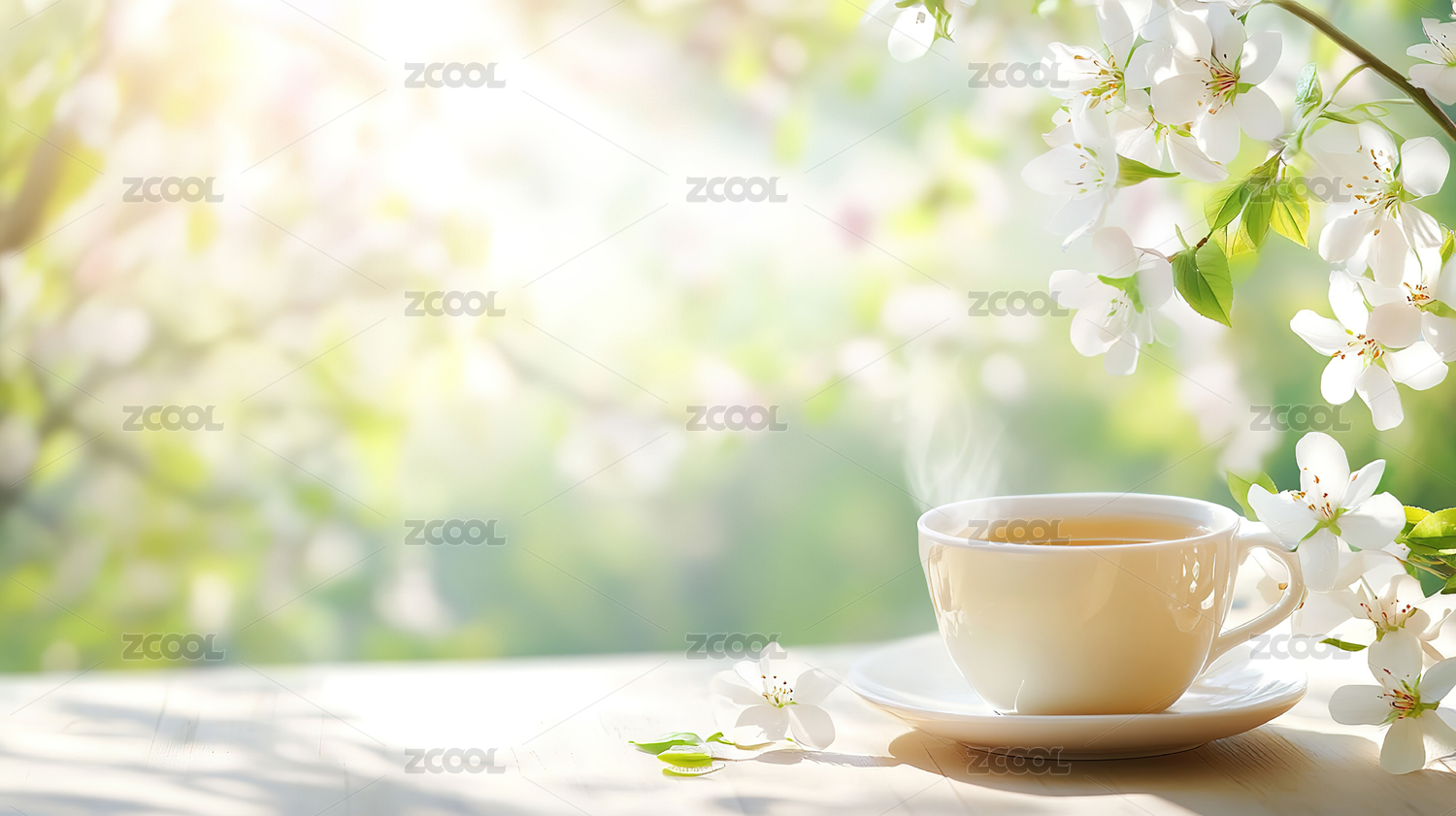 传统中式园林湖边一杯咖啡和曲奇饼干